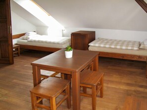 9-room farmhouse 350 m2 on 2 levels. Fully renovated in 2012, comfortable and tasteful furnishings: living/dining room with dining table and TV (flat screen), DVD. 1 room with 2 beds. Large dining room with sliding door with Scandinavian wood stove, dining table, kitchen corner and bar. Exit to the garden, to the terrace. Kitchen (oven, dishwasher, 4 ceramic glass hob hotplates, kettle, microwave, freezer, grill, electric coffee machine). Shower/WC. Underfloor heating. Upper floor: living/sleeping room with 1 bed, 1 double bed and TV (flat screen). 1 room with 2 beds. 1 room with 1 double bed, shower/WC and TV (flat screen). 1 room with 2 beds, shower/WC and TV (flat screen). 1 room with 2 beds and 1 double bed. Kitchenette (oven, 4 ceramic glass hob hotplates, microwave, electric coffee machine) with dining table. Bath/WC. Wooden floors, natural stone floors. Terrace furniture. Beautiful view of the garden. Facilities: washing machine, dryer, children's high chair, baby cot for up to 3 year olds, hair dryer. Internet (WiFi, free). Please note: suitable for families. Non-smoking house. Maximum 2 pets/ dogs allowed. Smoke alarm, fire extinguisher. Ground floor offers handicap proof apartment with private kitchen and bathroom.