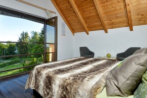 Bedroom 2: Under the pitched eaves of the annexe, this beautiful bedroom has a double bed, easy chairs, a large picture window with stunning views, a covered private balcony and an en suite bathroom.