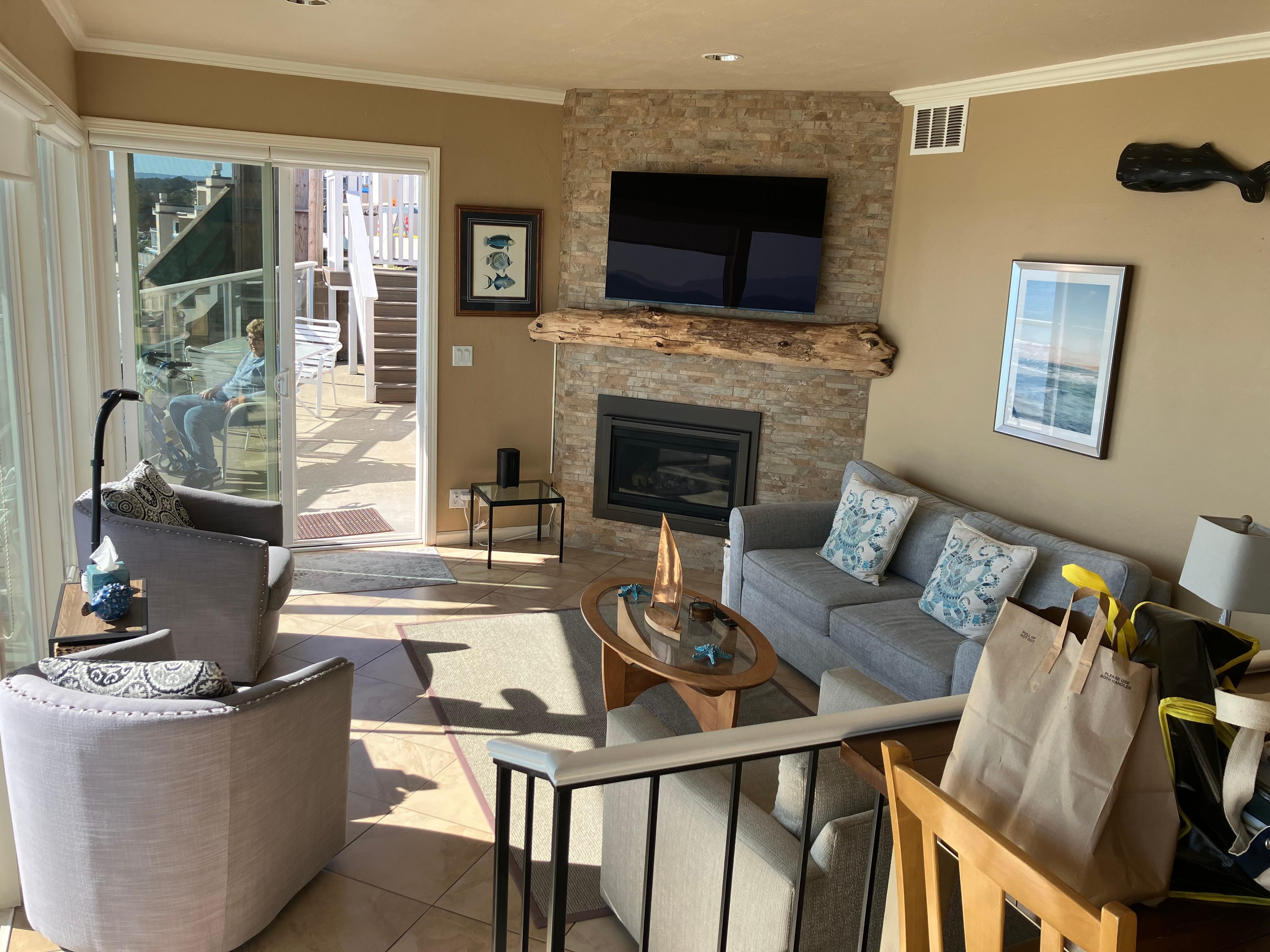 With one reserved parking space, this condo offers a great home base for exploring everything Santa Cruz has to offer! After a fun-filled day of coastal adventures, warm up by the gas fireplace in the main living area. Or get comfy on the plush couch and three armchairs and watch a movie on the 45-inch TV. You'll find everything you need in the well-equipped kitchen, including a gas range, microwave, and wine fridge. Serve up home-cooked dishes at the four-person dining table with two additional chairs and enjoy your meal with superb ocean views. Offering quiet privacy, the primary bedroom features a king bed, TV, and an in-suite bathroom with a walk-in shower. The second bedroom is furnished with two twin beds, and a guest bathroom provides a walk-in shower. A full-size washer/dryer is available.