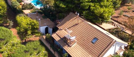 Η κατοικία βρίσκεται μέσα σε έναν δροσερό καταπράσινο κτήμα 2 στρεμμάτων, εκτός οικισμού, σε ήσυχη παραθαλάσσια περιοχή της ανατολικής Αττικής, εφτά λεπτά οδήγησης από την κοντινότερη παραλία (Ζούμπερι).