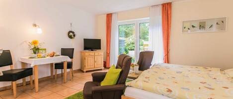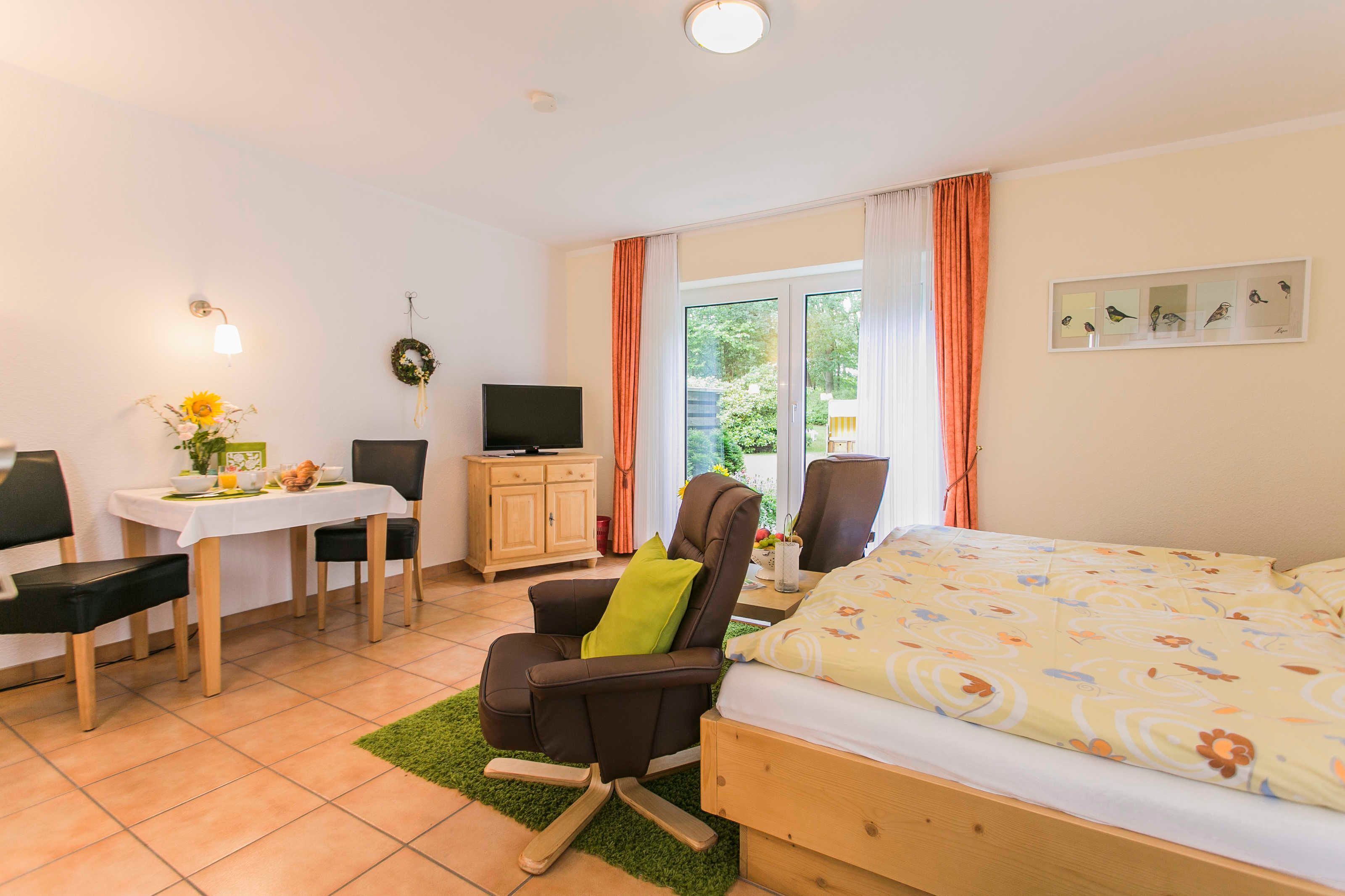 • 1-room apartment on the ground floor (35 sqm), • furnished terrace with access to the garden, • 1 living-bedroom with double bed in comfort height (1.80 x 2.00 m), • 2 armchairs and coffee table, • 1 dining area with 2 chairs, • 1 pantry with hob, fridge / freezer, sink, coffee maker, pots, crockery and cutlery, dish towels • 1 shower room, • WLAN, flat screen with cable TV, radio / CD player, bathrobes, table linen, dryer