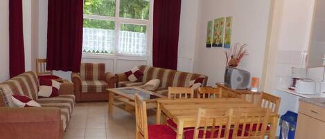 1-room apartment: Combined living and sleeping apartment (2-4 persons) with double bed and large sitting area: double sofa bed as an extra bed (no separate bedroom); Kitchen corner with stove, fridge and dishes; Bathroom, shower and toilet; Cabel TV; about 50 square meters;