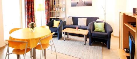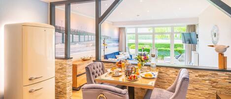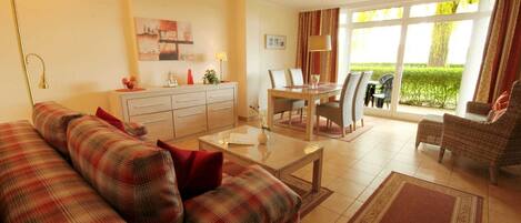 Your ultra-modern 2-room apartment 37RB1 (non-smoking) has a size of approx. 60 qm and is for max. 4 people furnished. It is located on the ground floor of the Villa Water Lilies. The associated south-facing terrace with a beautiful view all the way to the Schmachter See invites you to sunbathe and linger. The allergy-friendly apartment in vintage design is divided into a cozy living room with an open kitchen, a bedroom and a shower room with a vanity, toilet and cosmetic mirror. The living room has a cozy dining area and a seating area that also sleeps the 3rd and 4th Person offers, furnished. The technical equipment includes a flat screen TV and a hi-fi music system with internet radio and free WiFi access. The kitchen is perfectly equipped with a fridge / freezer, dishwasher, oven, ceramic hob, coffee machine, microwave, other electrical appliances and various kitchen aids. The bedroom has a comfortable box spring bed, a flat screen TV and a spacious wardrobe, which offers you enough storage space during your stay. In addition, the apartment has blackout pleated blinds. A parking space is available in the "Zentrum" car park (approx. 300m from the property).