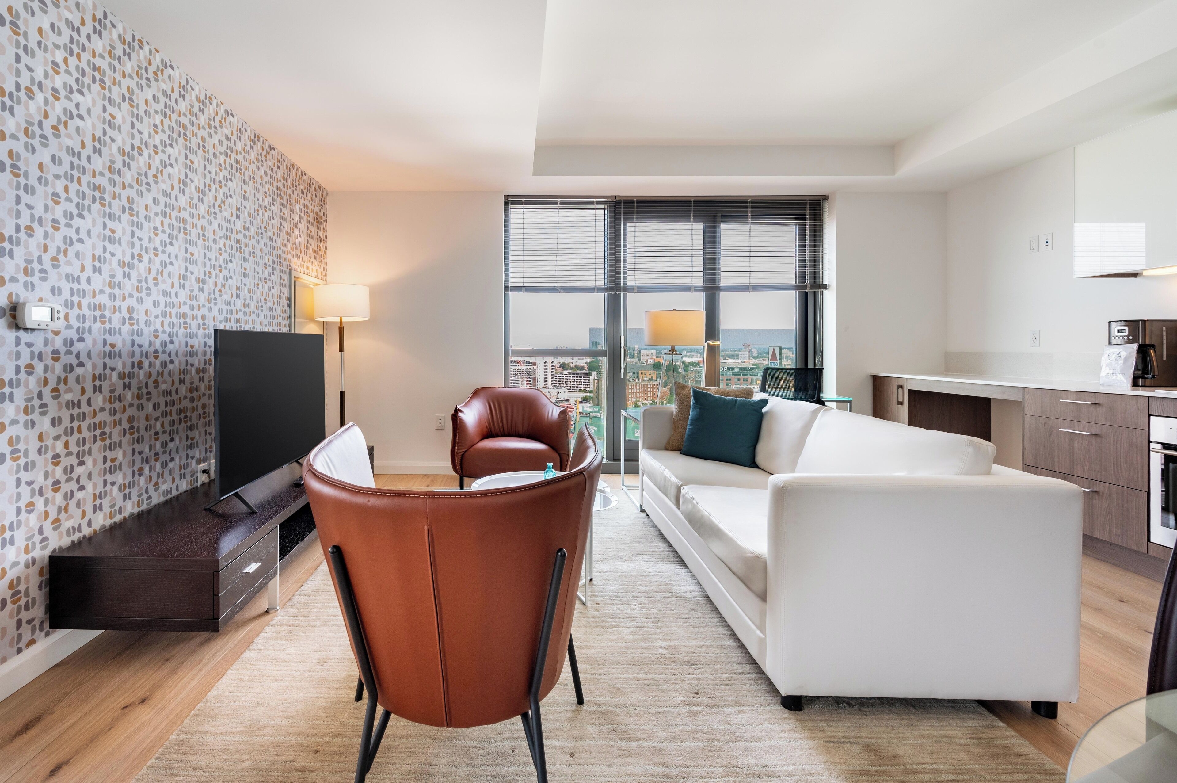 Enjoy the cultural capital of Boston, the Fenway Cultural District, while staying in this gorgeous one-bedroom apartment with floor-to-ceiling windows, high ceilings, German-engineered stainless steel appliances, white quartz countertops, European-style frameless kitchen cabinets with generous storage, smartphone-controlled lighting options, spa-inspired bathrooms, wide-plank flooring, wall-to-wall carpeting in the bedrooms and a front-loading washer and dryer in the apartment. All beds provided are, fitted with plush linens and pillows. All Furnished Quarters apartments include24/7 guest service.