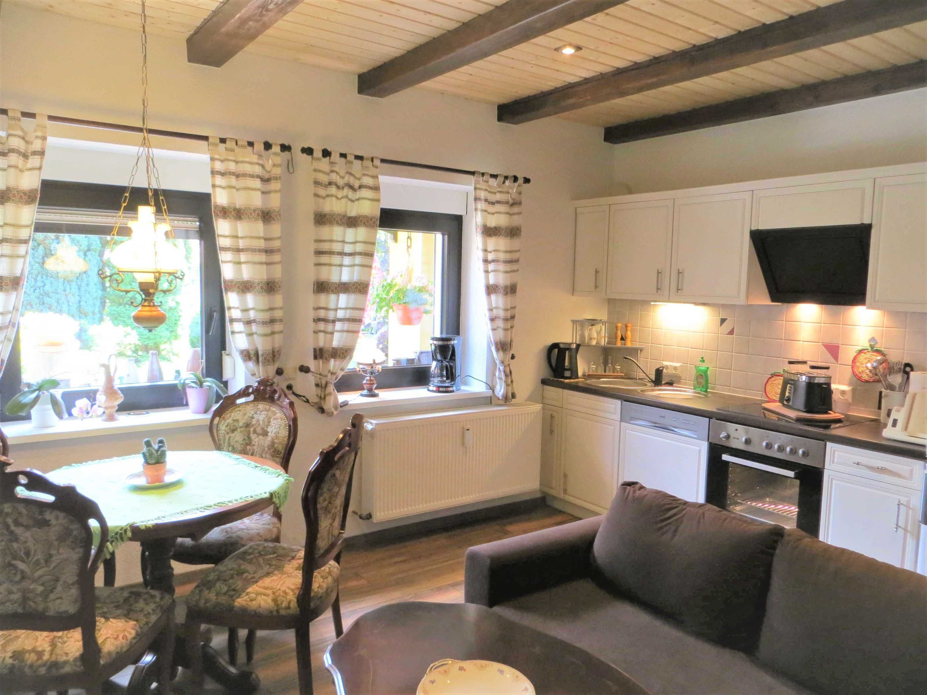 Coffee maker, toaster, bread slicer, electric kettle dishwasher, 4 flammiges stove, oven, refrigerator, microwave