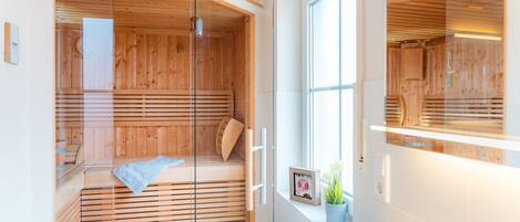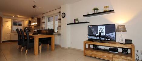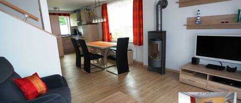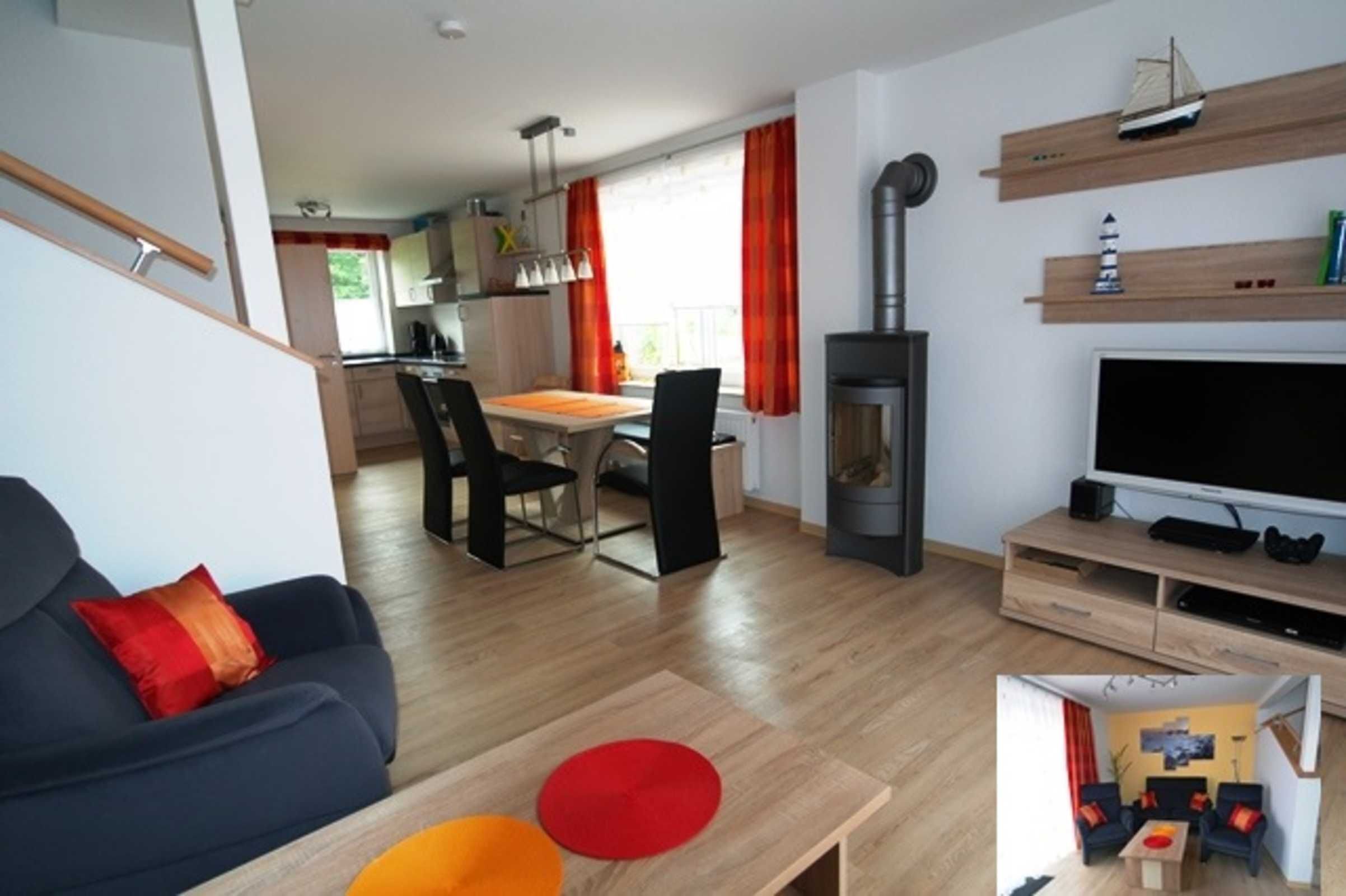In the holiday apartment you are welcomed by a spacious hallway, which has a maritime charm. Light-colored furniture offers plenty of space for your luggage. The large living room with integrated kitchenette exudes coziness. Underfloor heating throughout the apartment and a decentralized ventilation system always ensure a pleasant indoor climate. Make yourself comfortable in front of the fireplace on the large family sofa and enjoy the rustic charm. High-quality solid wood furniture with a view of the garden and the covered terrace invite you to spend relaxing family hours in the dining area. The country house style kitchen has extensive equipment that leaves nothing to be desired. The two bedrooms each have a double bed and are each equipped with a wall-mounted flat screen television. Both rooms have electric shutters. The "children's room" also houses some games and books that even the youngest visitors can keep busy.