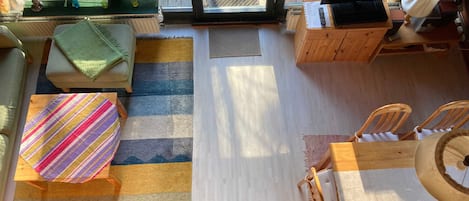 3 bedrooms (2 doubles, 1 single), kitchen with hatch to the living room, living room with dining area, terrace, bathroom with toilet and bath or shower, hallway with wardrobe, cable or satellite TV and radio. The Nurdachhaus exudes a dignified atmosphere. Living and sleeping areas extend over two floors. The construction has proven itself. Their special features are sloping walls, optimal use of space and a homely room climate. Between the living area and kitchen there is a hatch, so the food comes to the meals directly from the stove on the table. A space-saving staircase leads to the upper floor.