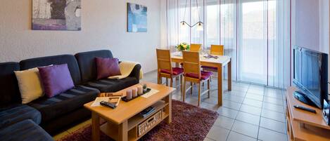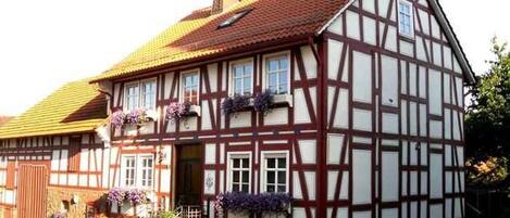 1. Apartment: 66 mÂČ living space for 1 - 6 people with balcony 5mÂČExclusive 66mÂČ, fully furnished for 6 people. Separate entrance and parking spaces in front of the house. In the living area there is a cozy seating area with a sleep function, rubber table, dining table and a TV flat screen for you. In the separate kitchen with corner seat, there is a fridge, dishwasher, microwave, E.- Cooker, kettle, egg cooker, toaster, coffee machine, bread machine and other kitchen helpers available. The apartment has two separate bedrooms and bathroom with bathtub, shower, hairdryer and toilet. Balcony with 5sqm.