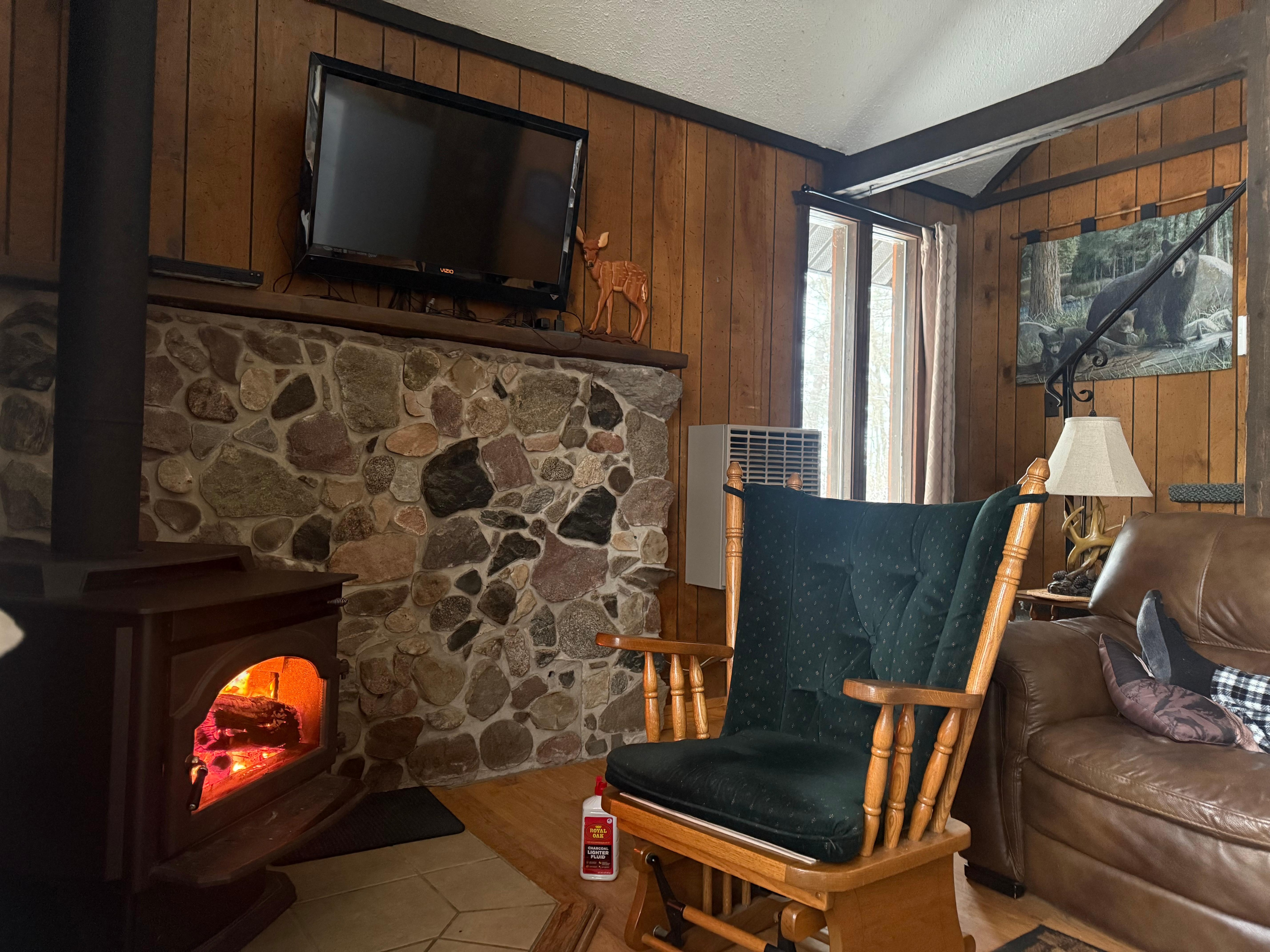 My husband and I came for his birthday sat in front of the nice warm fire and watched net flix. Beautiful lake scene very clean except for the dead mouse I found in a trap it’s very country backed up to a forest and is to be expected only saw one just wishing it had been thrown away prior to us coming in other then that place is spotless we come every year will be back again