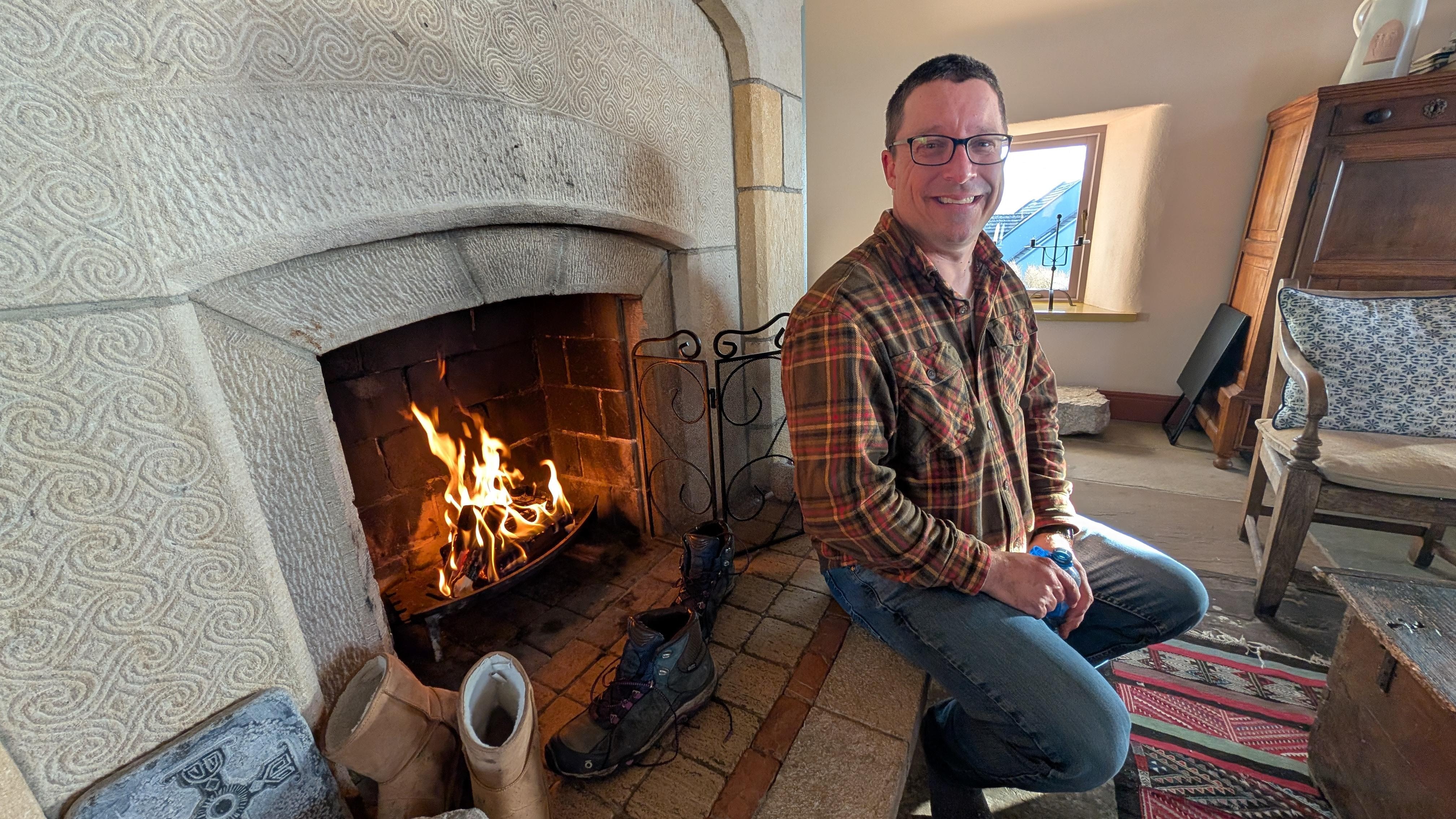 In the center of the room, there is a kitchen area with an antique table. Also, hidden behind the fireplace, there is a powder room. The entire house has under floor heating which is truly decadent in the cool Irish countryside.