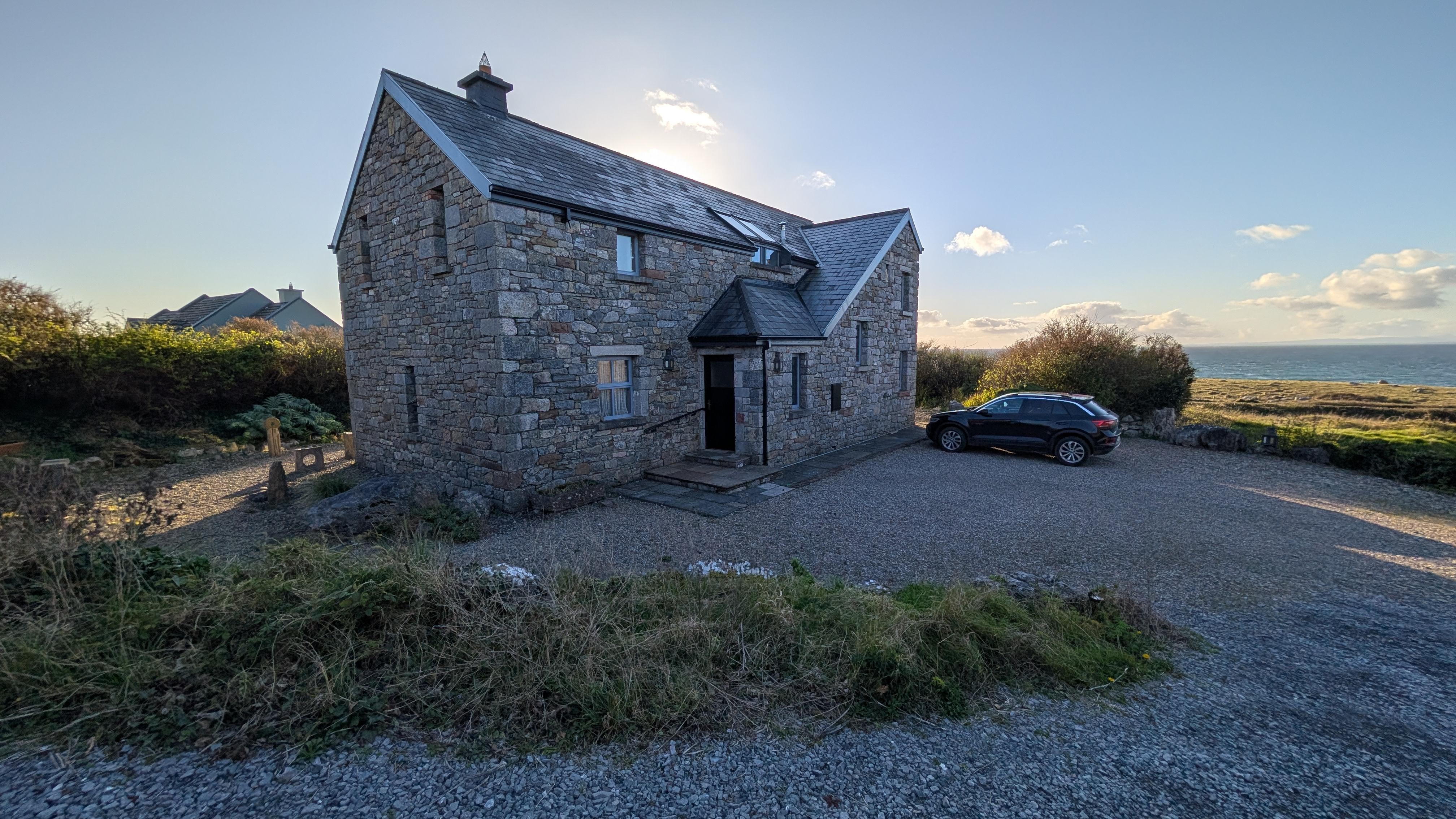 On the bottom floor there are two bedrooms both with en suite bathrooms. One bedroom has a king size bed while the other has a queen. There is a study just outside the master bedroom. Upstairs you will find a magnificent Great Room. At the one end there is a seating area in front of a gorgeous stone fireplace. At the other end you can sit and take in the Aran Islands, Galway Bay and breathtaking sunsets through the floor-to-ceiling windows.