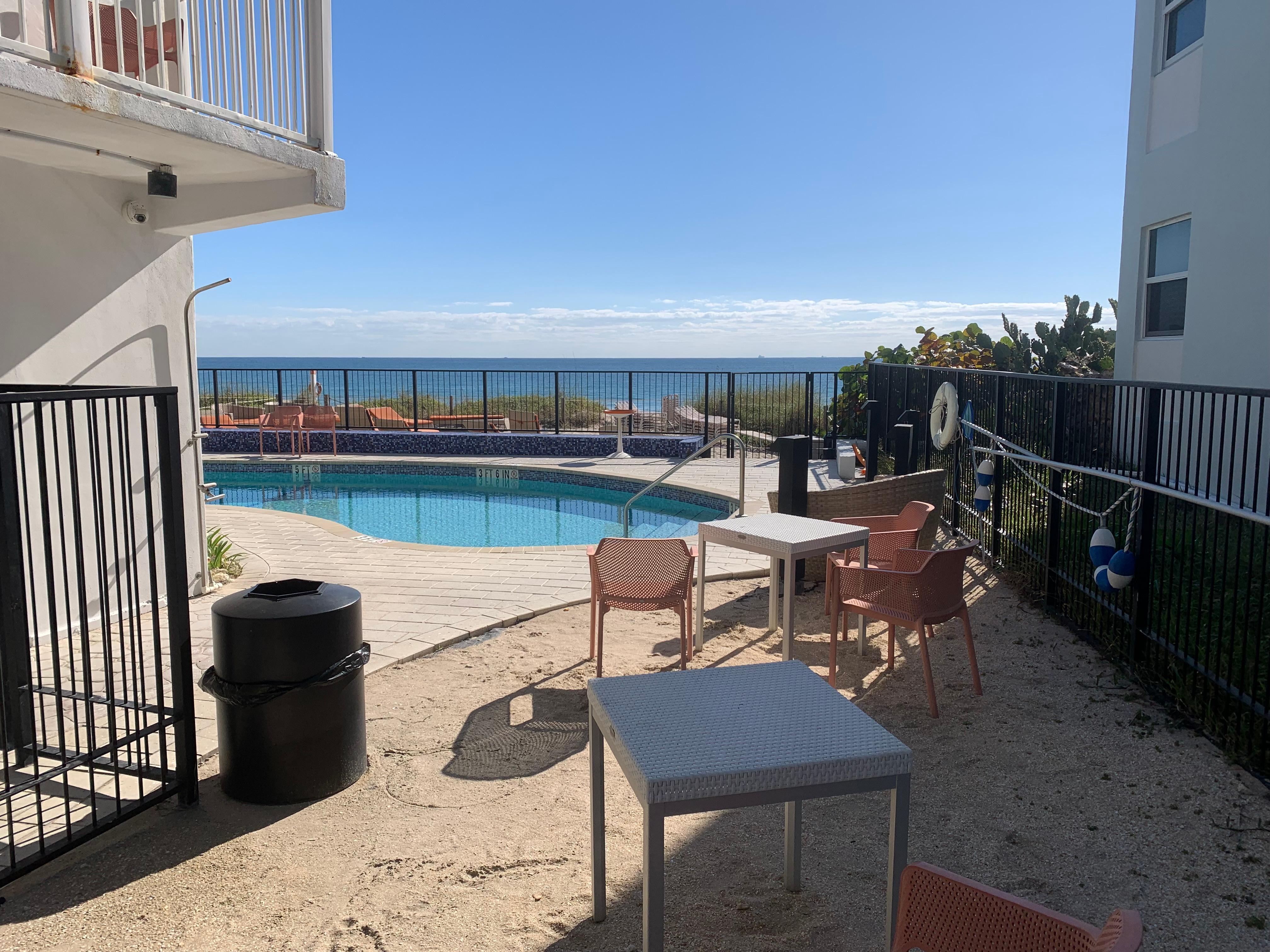 Very nice place, would recommend to anyone looking at an ocean front complex. Small complex thus less people. Pool was cleaned most of the days we were there. Very convenient as my son lives less than 2 blocks away. Great Stay within walking distance to bars and restaurants.