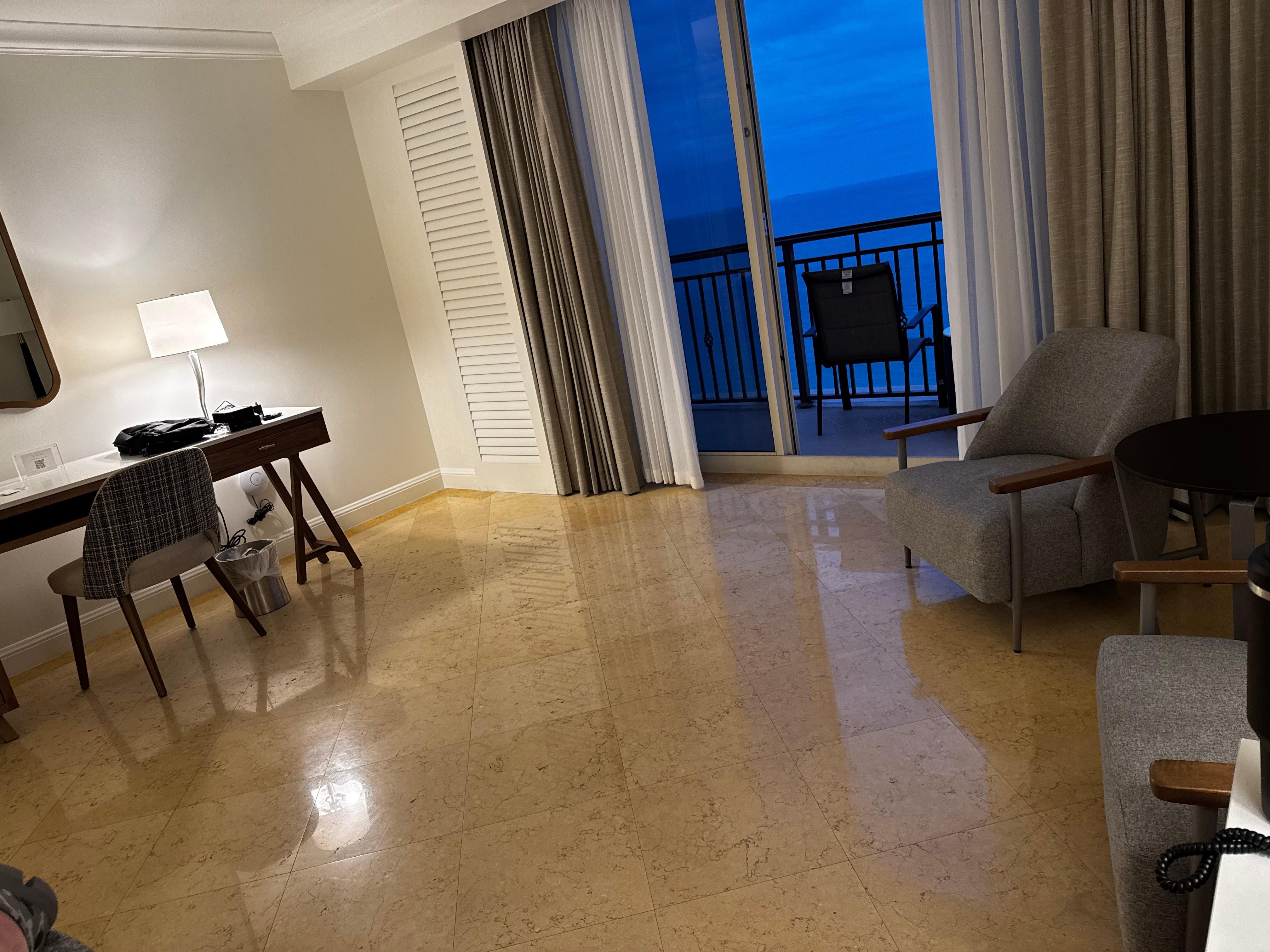 620 sqft . Oceanfront with one king bed. Balcony, fully equipped kitchenette. Large luxurious marble bathroom, 42' flat screen HDTV, in room safe, Bose CD player, bathrobe, lush pillowtop bed, down comforters and pillows, imported 300 thread count linens by frette, large desk.