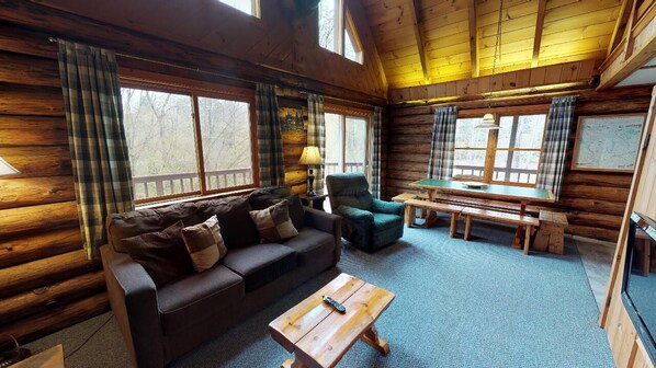 Two story log cabin. The first floor has a kitchen, dining area, living room with a gas burning fireplace and a sleeper sofa, and a bedroom with one full bed and one bunk bed. The second floor loft has a queen size bed and full bath.
