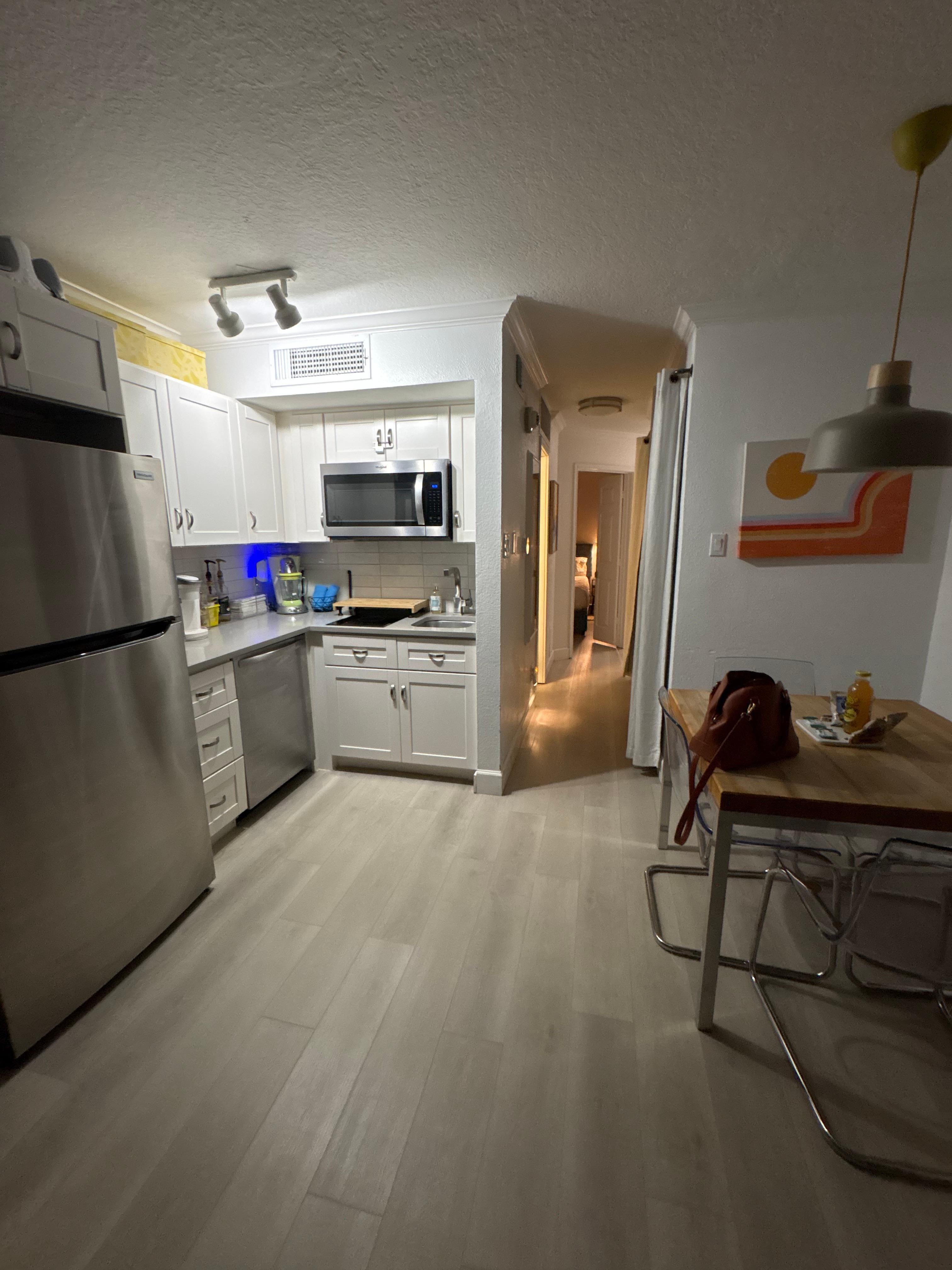 In the adjoining kitchen, you will find a dining table with seating for four and a full sized fridge/ freezer with a filtered ice maker and a Brita pitcher for filtered water, dishwasher, stovetop, and countertop over/air fryer. We have stocked it with lots of what you may need for cooking, including pots and pans, some basic cooking spices, and everything that you will need for making great coffee.