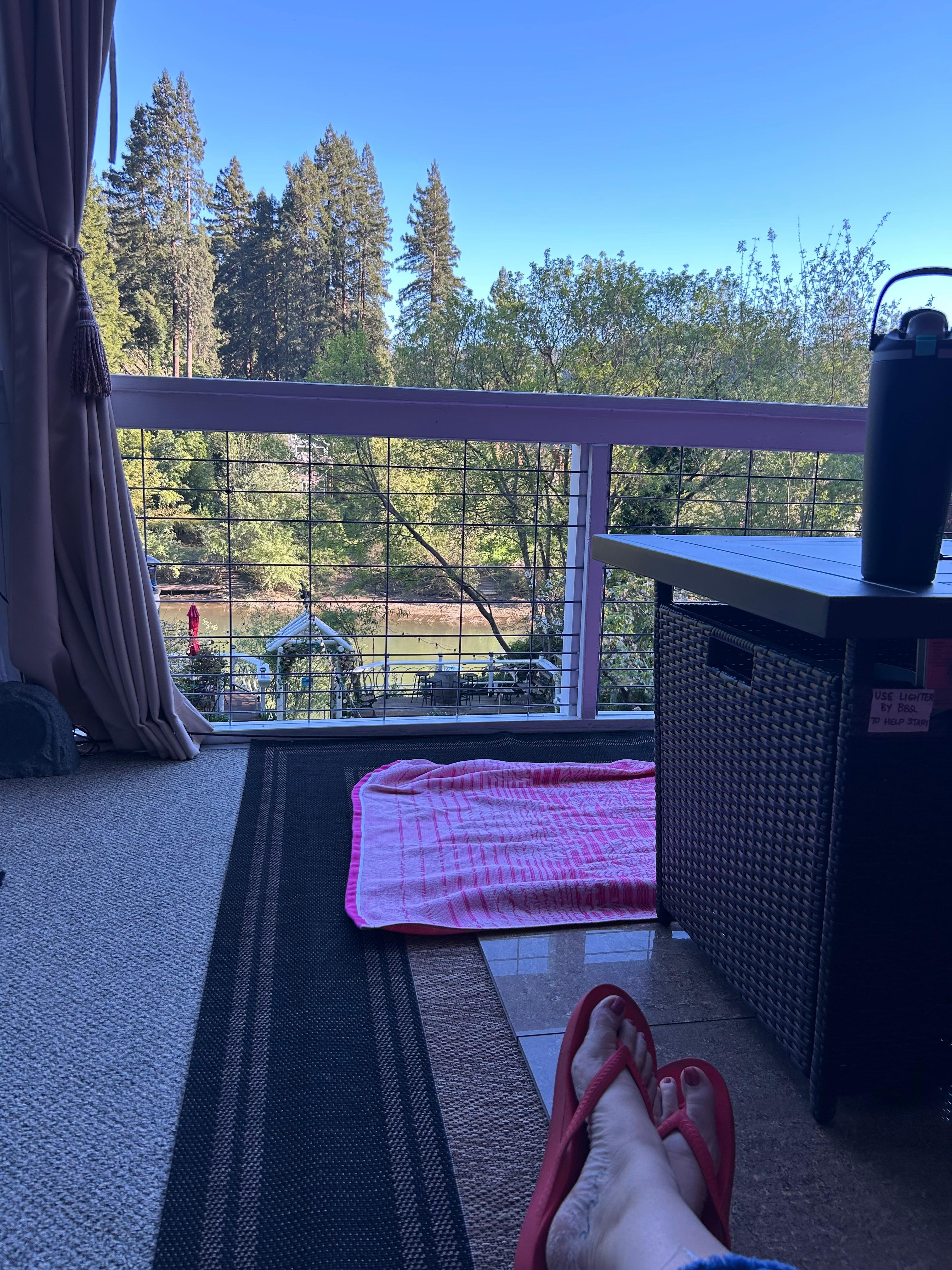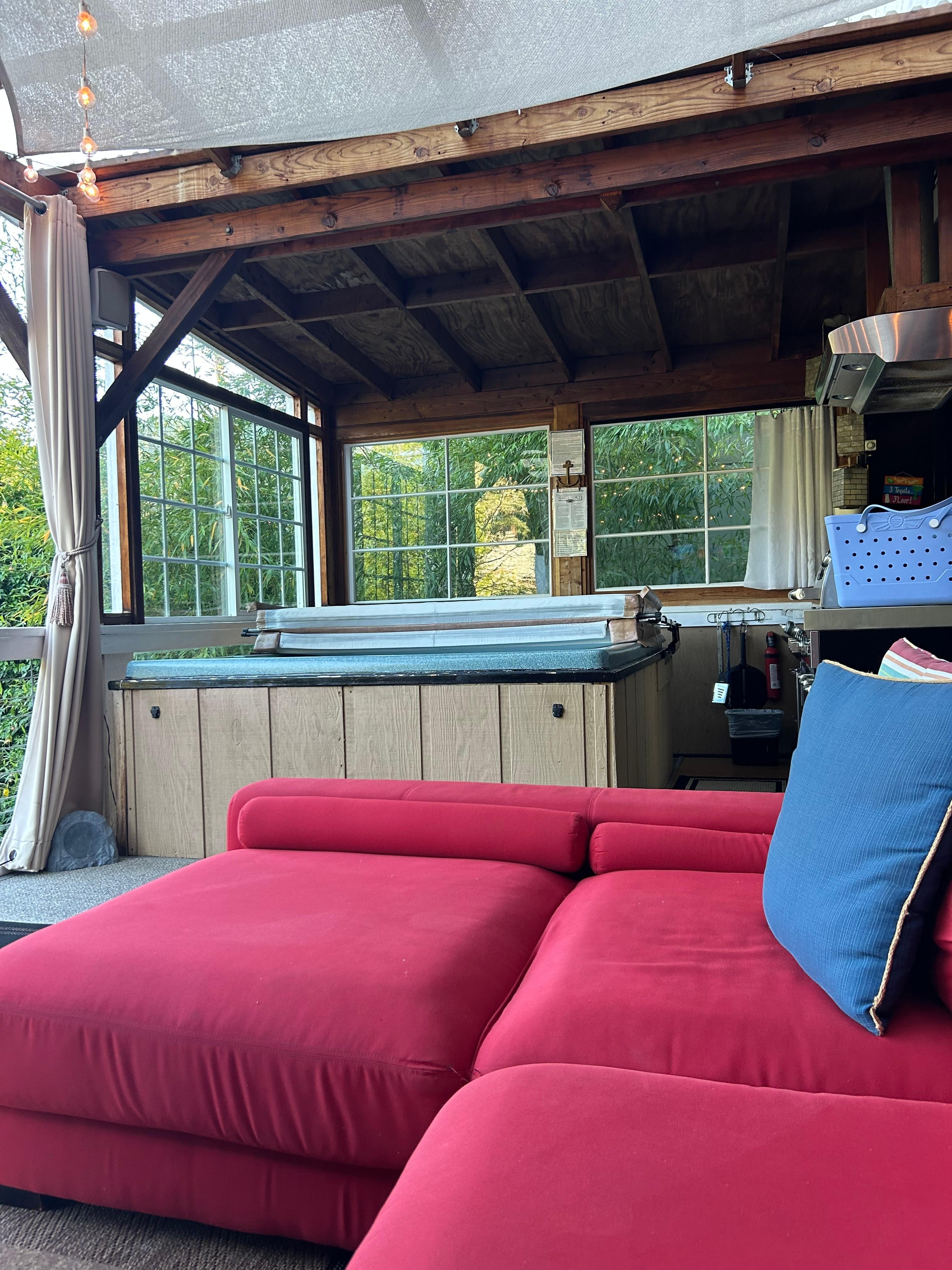 Riverscape's covered deck features sweeping views of the river, the redwoods, and the lush backyard. Experience luxury outdoor living complete with a 6 person hot tub; an outdoor kitchen with a bar, sink, large gas BBQ, and prep area; an outdoor living room with couches, a 50' HDTV with Directv and surround sound, dvd player, a pool table/ping pong table, and a washer and dryer. On chilly evenings, you can light up the outdoor heater, and close the canvas curtains to keep snugly while listening to the river slide by.