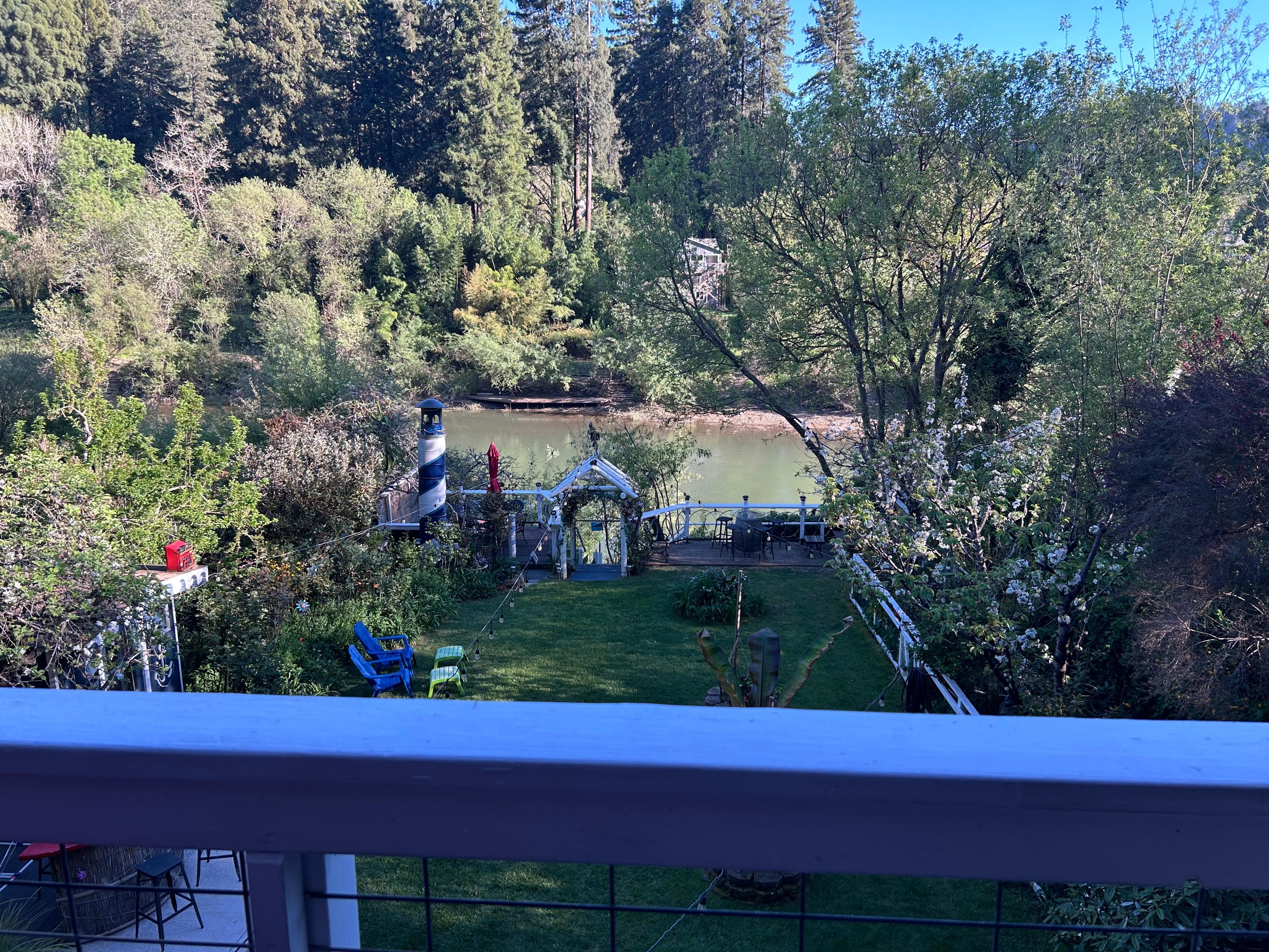 Just off the deck, the backstairs lead down to a large grassy, fenced backyard with a horseshoe pit, and plenty of room to play amongst beds of beautiful flowers, roses, and banana trees. We have lots of fruit trees, cherry, plum, 2 apples, pears you are welcome to enjoy when in season. There is also an outdoor shower with hot and cold water to rinse off after the river, or just enjoy taking a shower outside under the stars. Situated under the canopy of an apple tree, is the Boat House which is the perfect place to take a nap on the futon, or change clothes after coming up from the river. The Boat house also has lifejackets, paddles for the kayaks, and other toys to play in the River or the yard with.