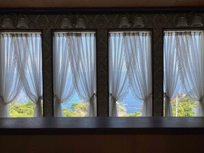 Luxrious double room with mountain view and ocean view from the balcony and an interior window / Hamada Shimane
