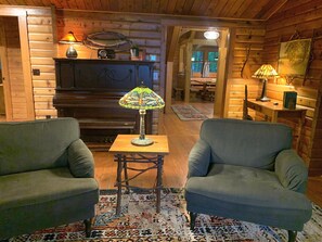 Runamuk Roost has a comfortable main floor living room complete with an indoor stone gas log fireplace, cable TV, Apple TV, Netflix and cozy sitting areas. The room is full of antiques, vintage decorations, and overlooks the lake.