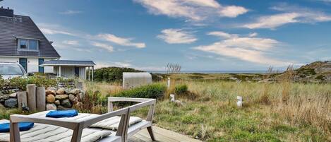 The apartment is divided into a living area with an adjacent kitchenette, a bedroom and a shower room on the ground floor. A staircase leads to the garden level, where there is another bedroom with a double bed and an internal shower room. On the garden floor there is also another room with a single bed, which is also inside and does not have a window. The living area leads to the balcony to the south with a view over the golf course to the Hotel Budersand and the islands Amrum and Föhr beyond.