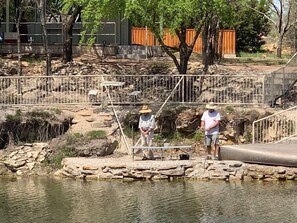 The property overall is pretty much everything you could want in a getaway from the city. It has tons to do and explore, or to just take a breath and relax. It's a large property, but there's plenty of signage to help you get where you're going. The Inspiration cabin is full-fledged glamping, from the private bathroom with a tab/shower to a functional mini-kitchen and excellent wifi. The hosts greeted us on arrival and were incredibly gracious and helpful. The cabin site itself is situated at the crest of a hill, with a lovely eastward view. Trails, ponds, and the small lake on property are all closeby. It was a perfect spot for us and our 2 dogs, and we will absolutely visit again.
