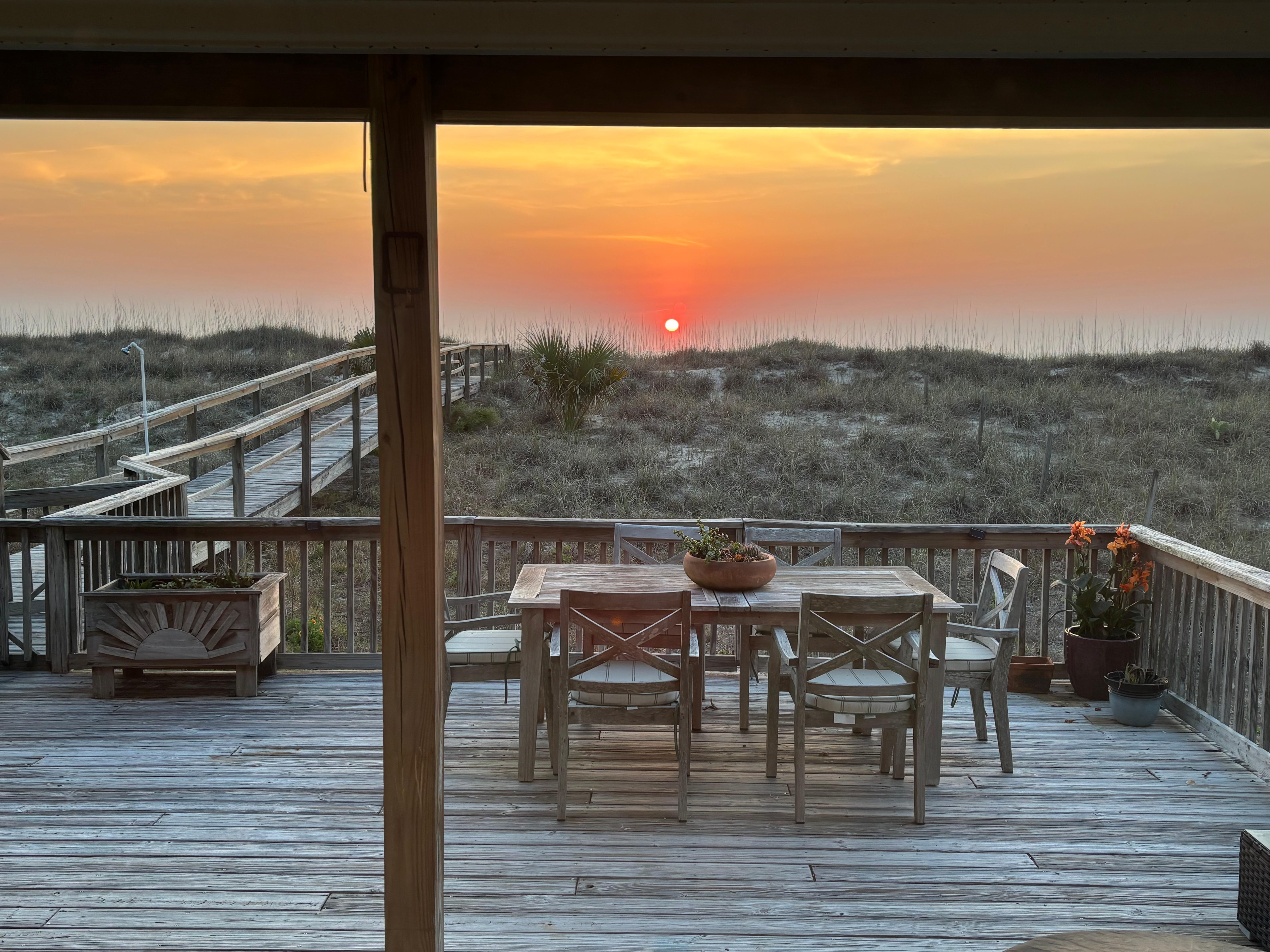 Retreat through one of the sliding doors to your own large, private oceanfront deck. Lounge in the hammock in the shade, have happy hour on the outdoor sectional, enjoy our *new* gas fire pit while listening to the ocean waves, or host a dinner party at the solid teak table which seats six. Cook your own dinner and pick your fresh herbs from one of our well-maintained, raised garden beds, or have our private chef come cook in for you and your guests! Enjoy your morning coffee in one of two large lounge chairs with cushioned ottoman overlooking the dunes and listening to the sound of the waves (keep an eye out for the gopher turtles- mornings are when they love to make an appearance in the dunes!).