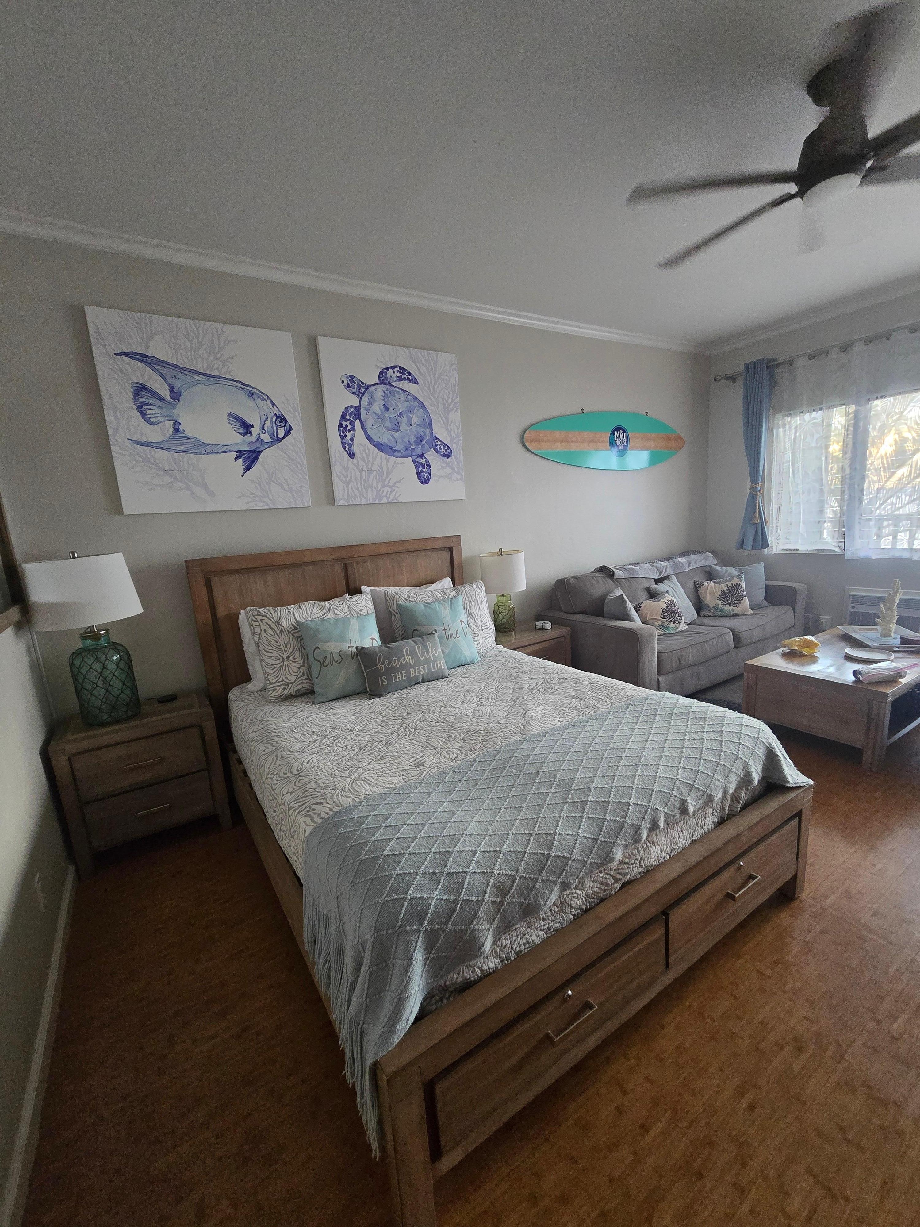 As spectacular as the beauty is outdoors … we encourage you to come back inside, make yourself at home, and experience the comfort of our condo; designed with clean modern furnishings with Hawaiian accents and decor. The kitchen is stocked with all the necessities (pots, pans, cutlery, air fryer, etc) so you can cook at home if you so choose. We also try to keep basics in the cupboards such as oils, spices, coffee, creamer, etc..