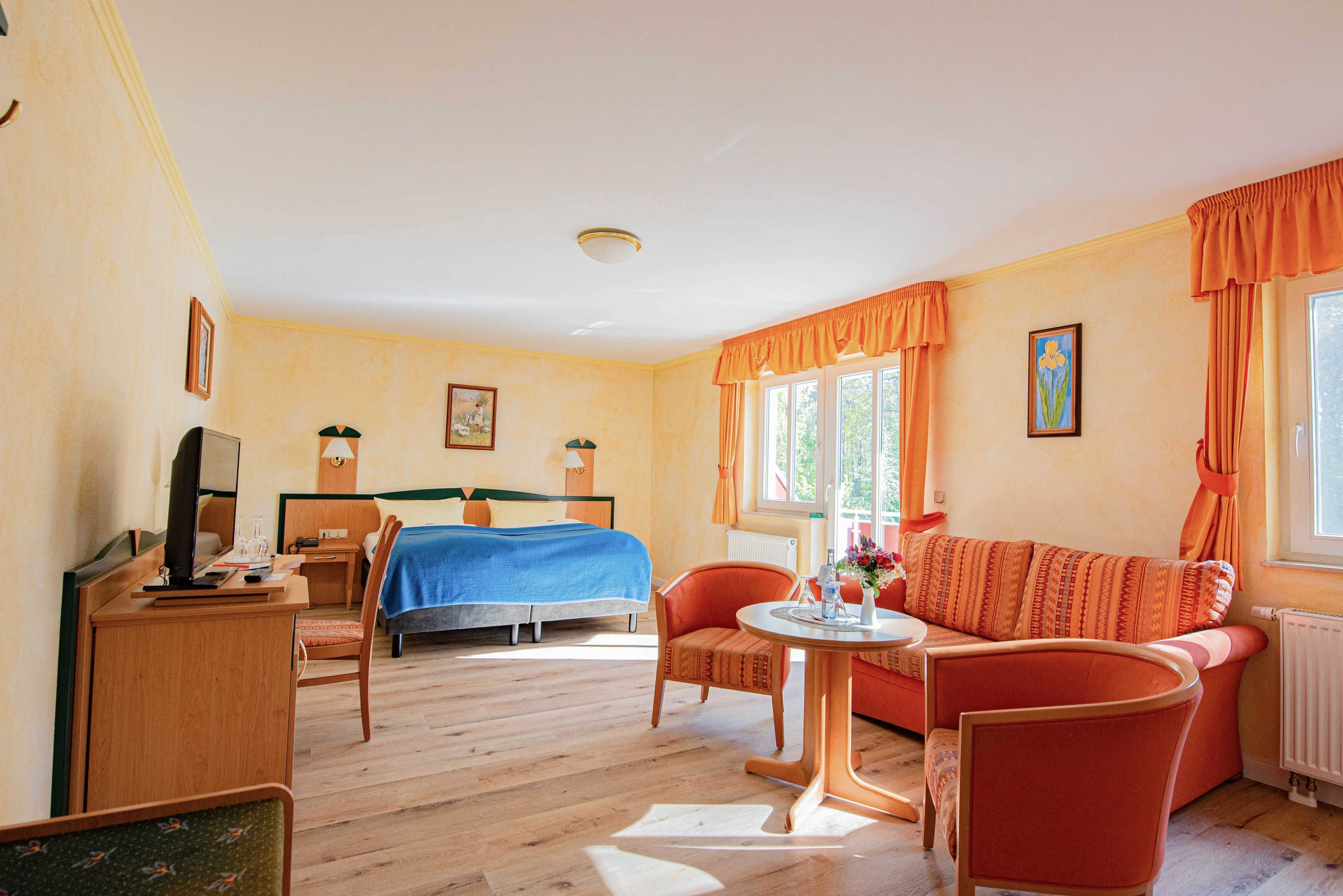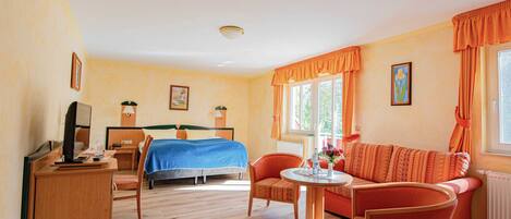 Our handicapped friendly, spacious double room is comfortably furnished with satellite TV, telephone, a sitting area with 2 armchairs, desk, double bed, terrace and a fridge. The bathroom has a shower & toilet, hair dryer. The double room is very suitable for wheelchair users. Pet are allowed. Cot available on request.