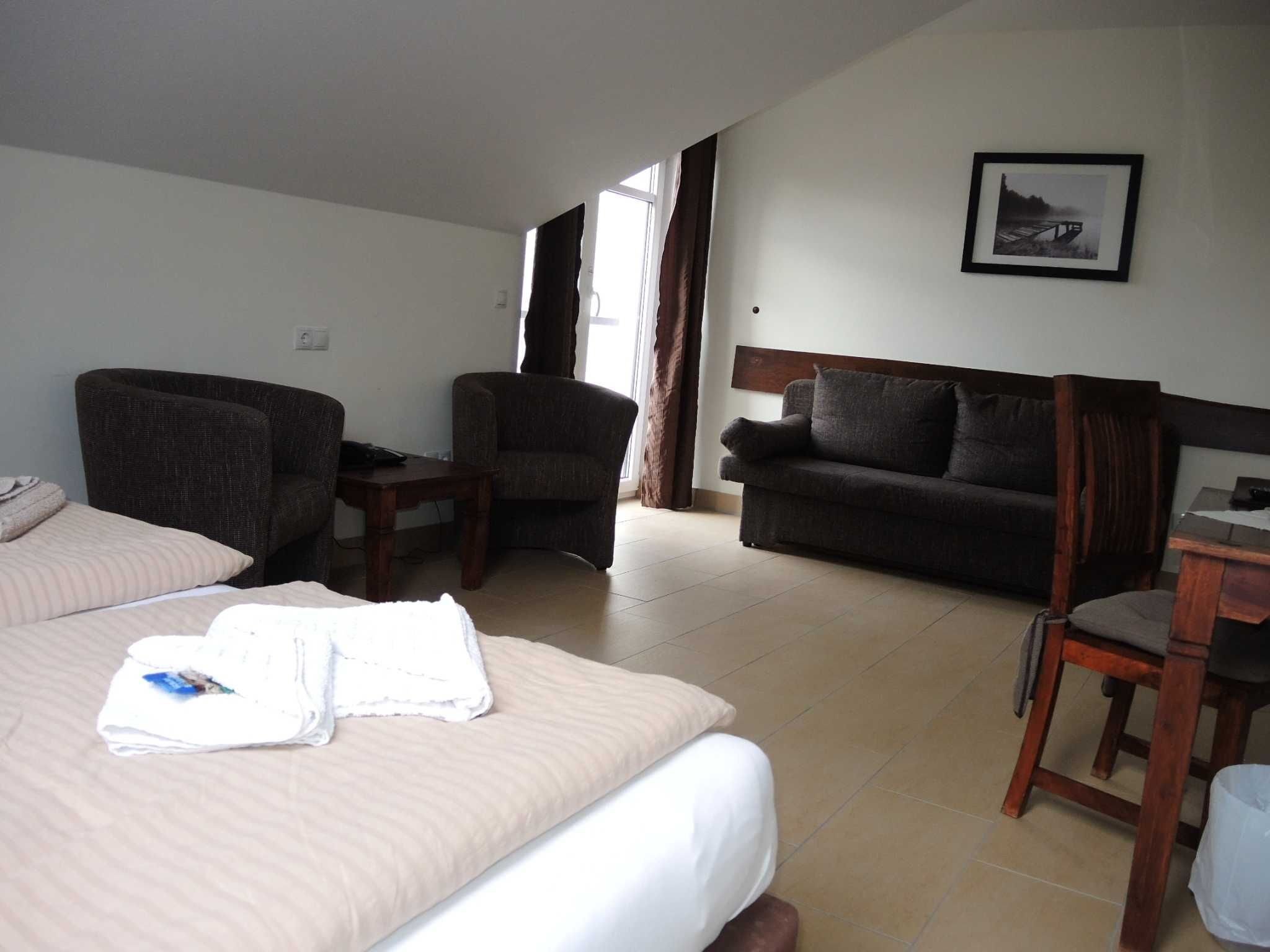 The colonial style double room is equipped with a double bed (also individually adjustable), desk, wardrobe with safe fold-out couch and TV. The room has evening sun.