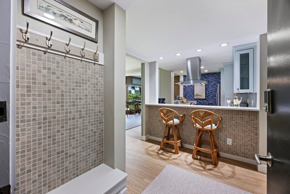 Inside, a bright open floor plan welcomes you with recent renovations and abundant natural light pouring through large windows. The open floor plan of the main living space features a great room with cozy sectional sofa, tasteful décor, a large flat-screen TV, and sliding glass doors that lead to a private balcony with serene golf and lagoon views. Gather around the dining table with its oversized picture window framing the fairway, or step into the enclosed porch with tile floors and a ceiling fan for another spot to take in the scenery. The modern kitchen is both stylish and functional, featuring custom cabinetry, stainless steel appliances, a breakfast bar, and plenty of storage. The open design keeps the space connected to the living area, perfect for entertaining or enjoying casual family time.