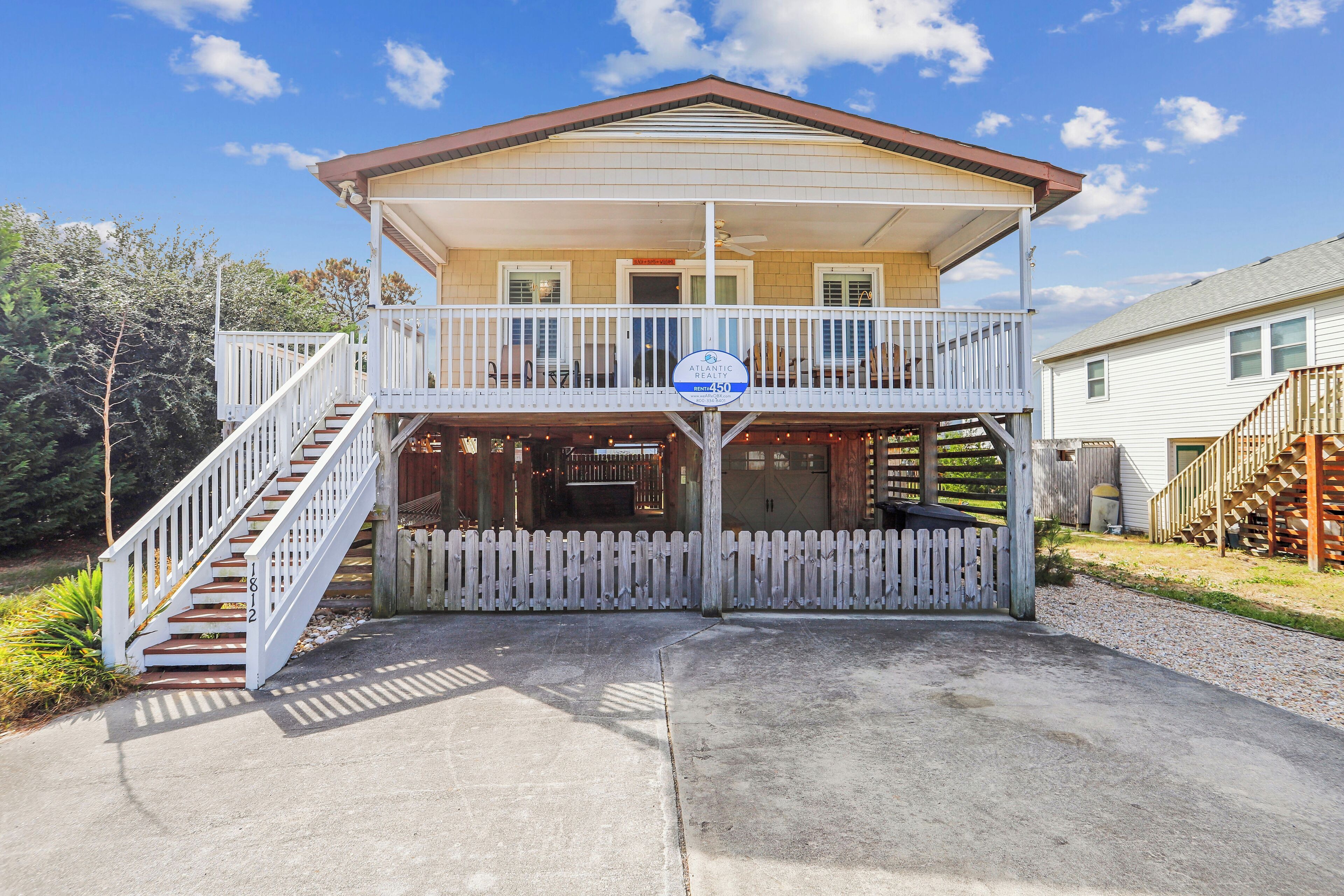 When it's time to settle down for the night, you'll rest easy in one of the three comfortable bedrooms all located down the hallway. Get some rest in the King Master Bedroom with a TV and its own private bathroom with a shower/tub combo or the Queen Bedroom with a TV. The third and final bedroom has 2 Twin Beds and easy access to one of the 2 Hallway Bathrooms. Each of these rooms is comfortable and tastefully decorated to ensure the ultimate comfort while you stay at RVA Hideaway on vacation. Downstairs, a driveway and carport offer plenty of parking. A covered entry by the carport provides access to a convenient laundry area with a couch. After a day of playing in the sun and sand, rinse off in the outdoor shower located behind the house. An outdoor eating area makes dining al fresco a breeze since it's located under the carport and offers plenty of shade.
