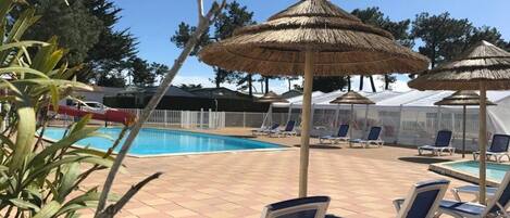 disposal. A swimming pool with a slide, a playground, a children's club