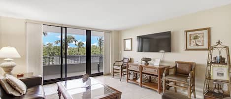Step into the spacious living room, where two plush couches invite you to unwind in front of the television. Floor-to-ceiling sliding glass doors seamlessly connect the indoors with the outdoors, leading to an expansive balcony furnished with tables, chairs, and sun loungers—the perfect spot for your morning coffee, a refreshing sea breeze, or a front-row seat to the dolphins playing in the Gulf.