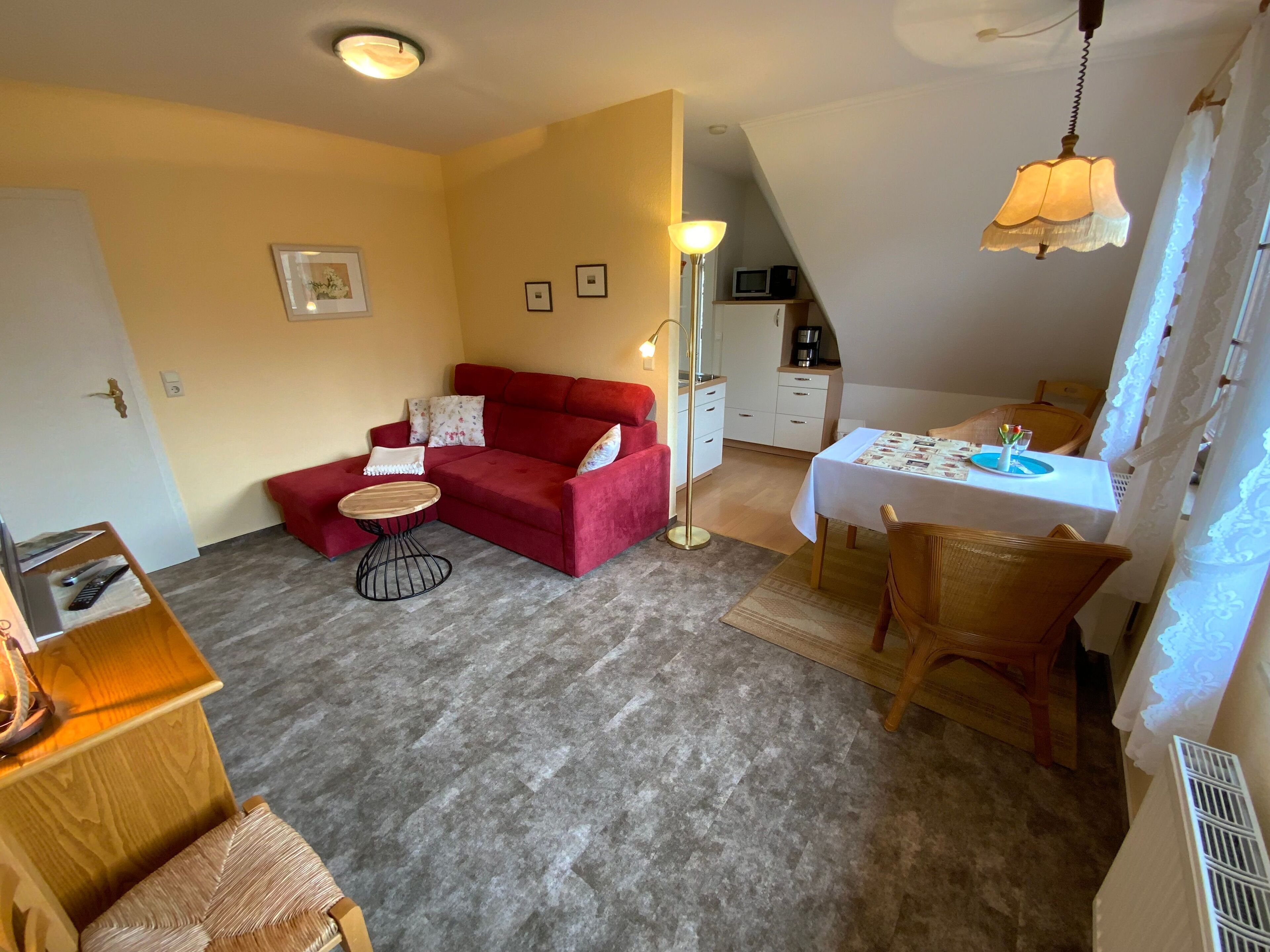 From the terrace you can enjoy the sun and enjoy the water. In the living room, there is a comfortable couch with a table, a wardrobe and a modern flat-screen TV. The separate kitchen is fully equipped with a hob, hood, oven, dishwasher, microwave, kettle, coffee maker, toaster and fridge. Here is also a dining table with seating and chairs. The bedroom is furnished with a comfortable double bed with bedside tables and reading lamps and a wardrobe. Here is also another single bed. For a. 4 Guest can be provided an extra bed if required.