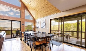 Escape to Foggy Goggles, a stunning mountain chalet offering breathtaking views of Deep Creek Lake and the surrounding mountains. Sunlight pours through floor-to-ceiling windows, illuminating the great room with its soaring ceilings and magnificent stone fireplace. This luxurious retreat perfectly blends rustic charm with modern comfort, creating an unforgettable getaway.