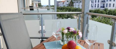 Fewo mit Balkon und Strandkorb am Strand