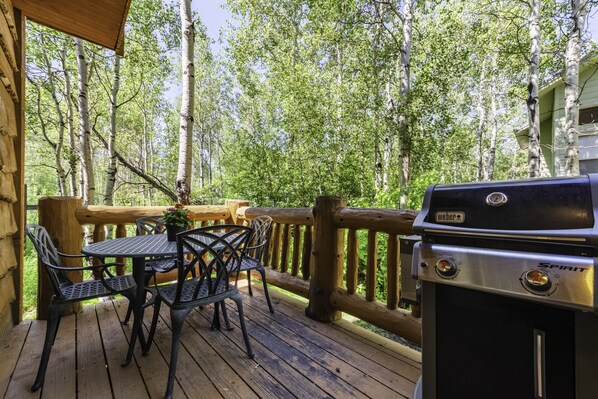 Step out onto the private deck perched among majestic Aspen shade trees, set up for intimate dining, birdwatching, reading or grilling on the propane BBQ.