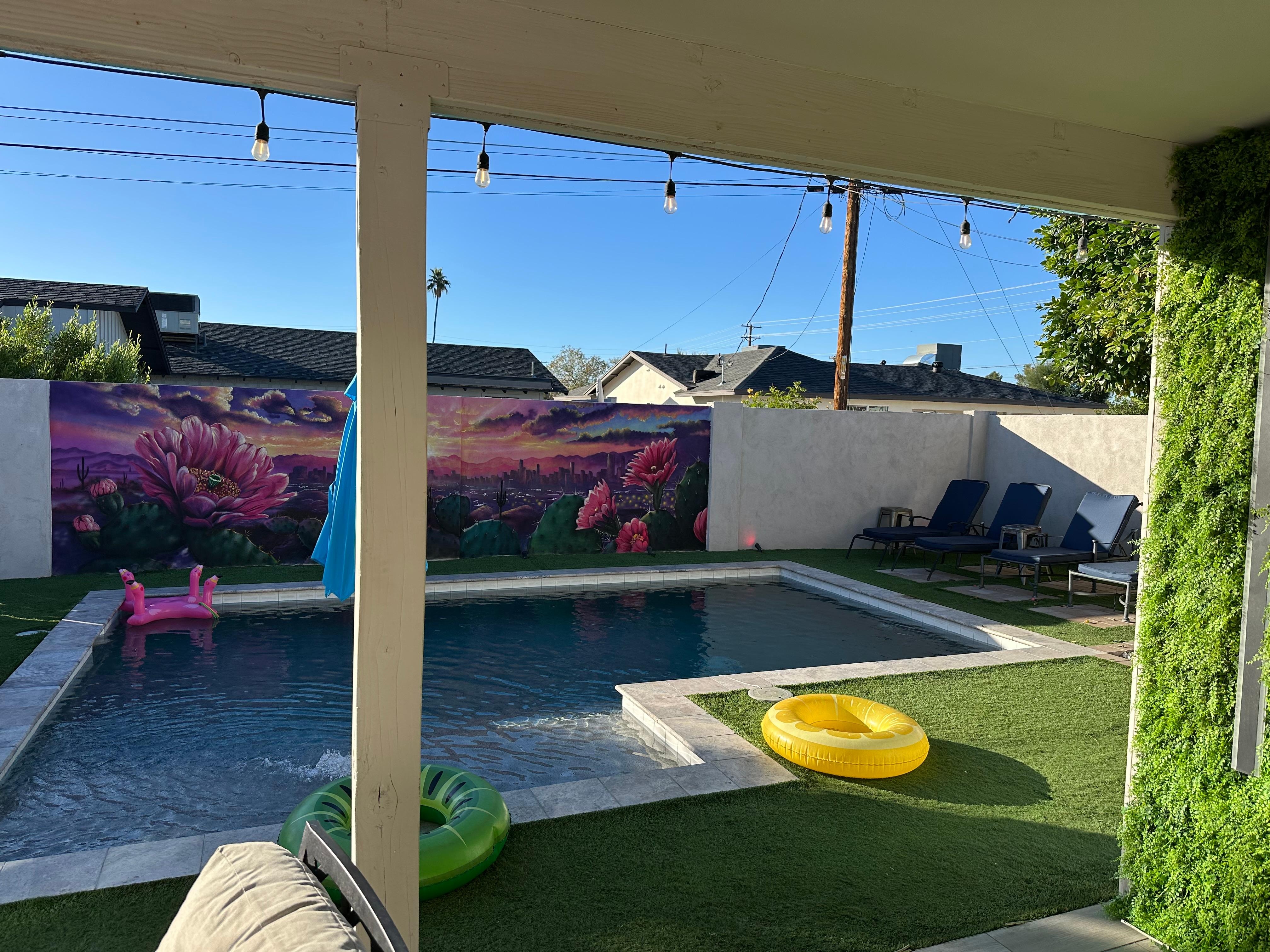 Endless Summer is a 5BR, 7Bed, 3Bath Theme Based Vacation Home Located in Old Town Scottsdale. Spend the Day Next to the 82° Heated Pool (Pool Heat optional at $75 night) w/ 6 Chaise Lounge Chairs - 2 large day bed lounge chairs & 4 traditional chaise lounge chairs. Get Ready for Dinner, Have Drinks, Play Ping Pong and Cornhole, & Take Pictures in front of our 4 Murals, Neon Lights, and Selfie Stations. Enjoy the Night Out in Neighboring Old Town Scottsdale & then Return Home to Watch the Pool Fountain & Backyard Light Show.
