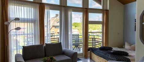 Spacious, lovingly furnished, 55mÂČ large 2-room apartment with panoramic windows, underfloor heating and small, fully equipped kitchen and a small hallway and a separate bathroom with shower and toilet. There are in the bedroom a double bed (180x200, separate mattresses) and in the living room a sofa bed as Aufbettungsmöglichkeit for max. 2 people available. In addition, a cot or an extra bed (90x200) for children up to 12 years can be set up. The apartment overlooks the water or the green areas - some have a terrace or balcony.