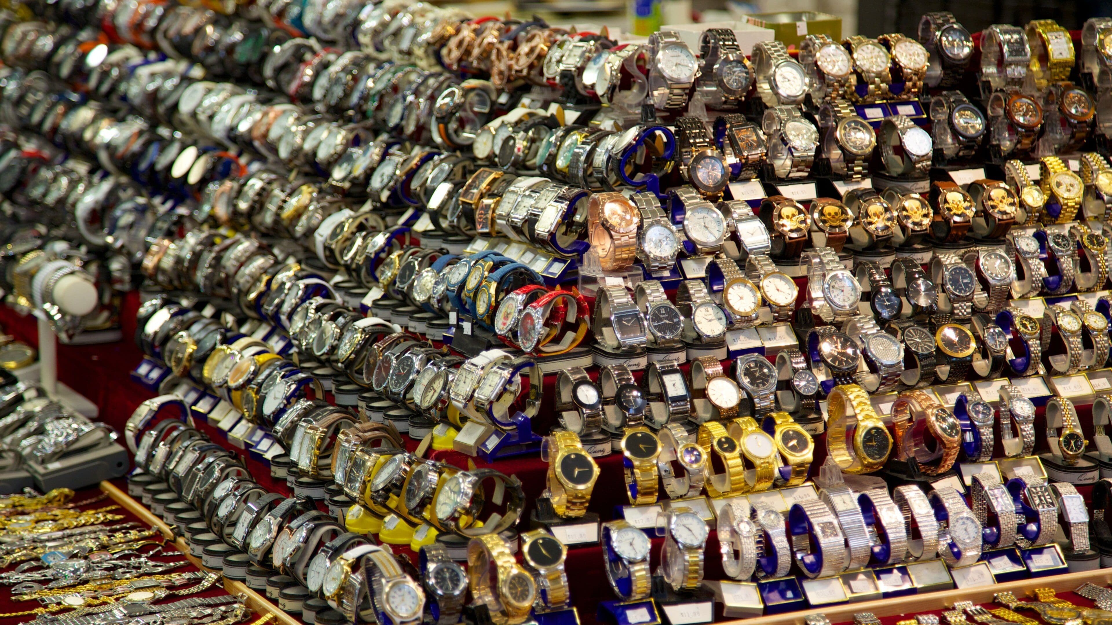 Numerous stylish watches displayed at the Festival Flea Market in Pompano Beach, Florida during a busy shopping day