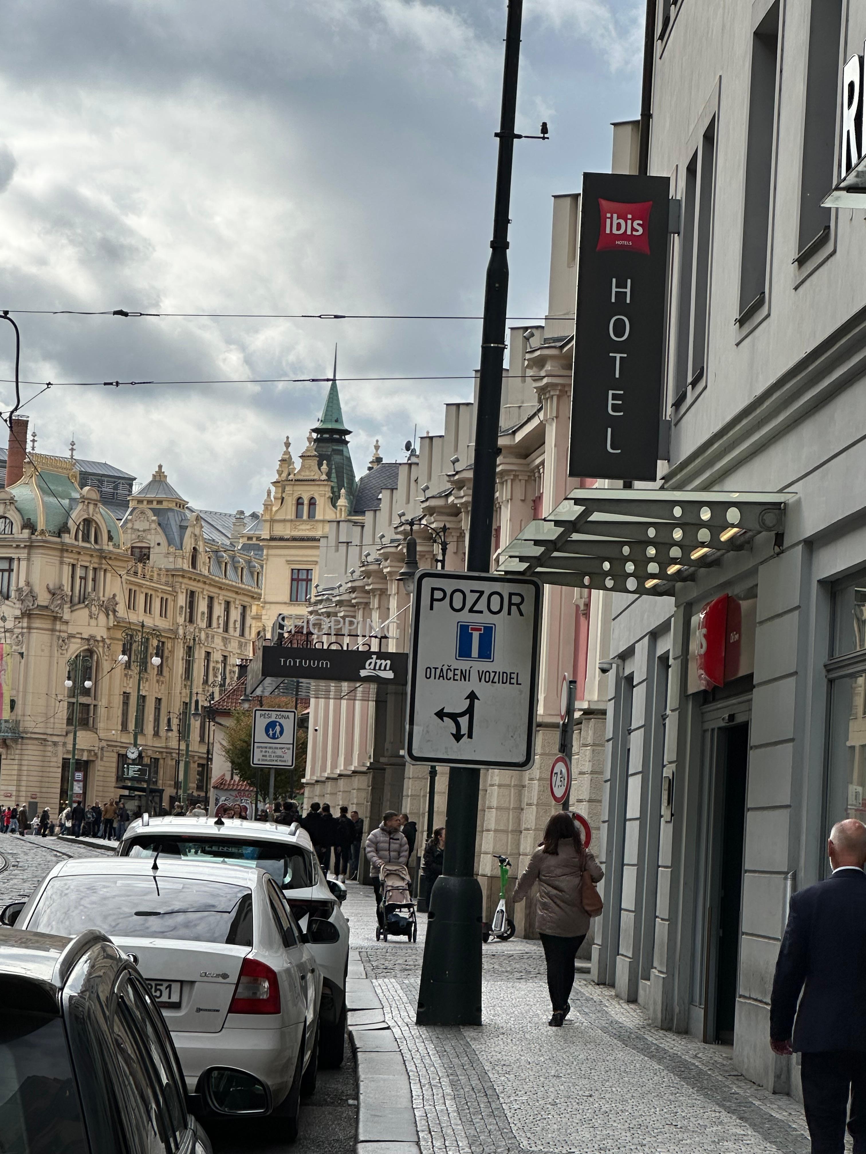 My daughter and I arrived in the evening after driving from Regensburg, Germany, and I wove through car and tram traffic as she navigated to Ibis Praha Old Town. We'd looked at Google Streetview ahead of time, so we knew what the parking entrance would look like as we came down the street and we "stuck the landing" on our first pass. Our rental car was an Opel Astra, which was just about as long a vehicle as one would want to take down the tight spiral ramp to hotel parking on level -3. The car's front bumper alarm was chiming while the rear tires were squealing on the curb all the way down to our level.