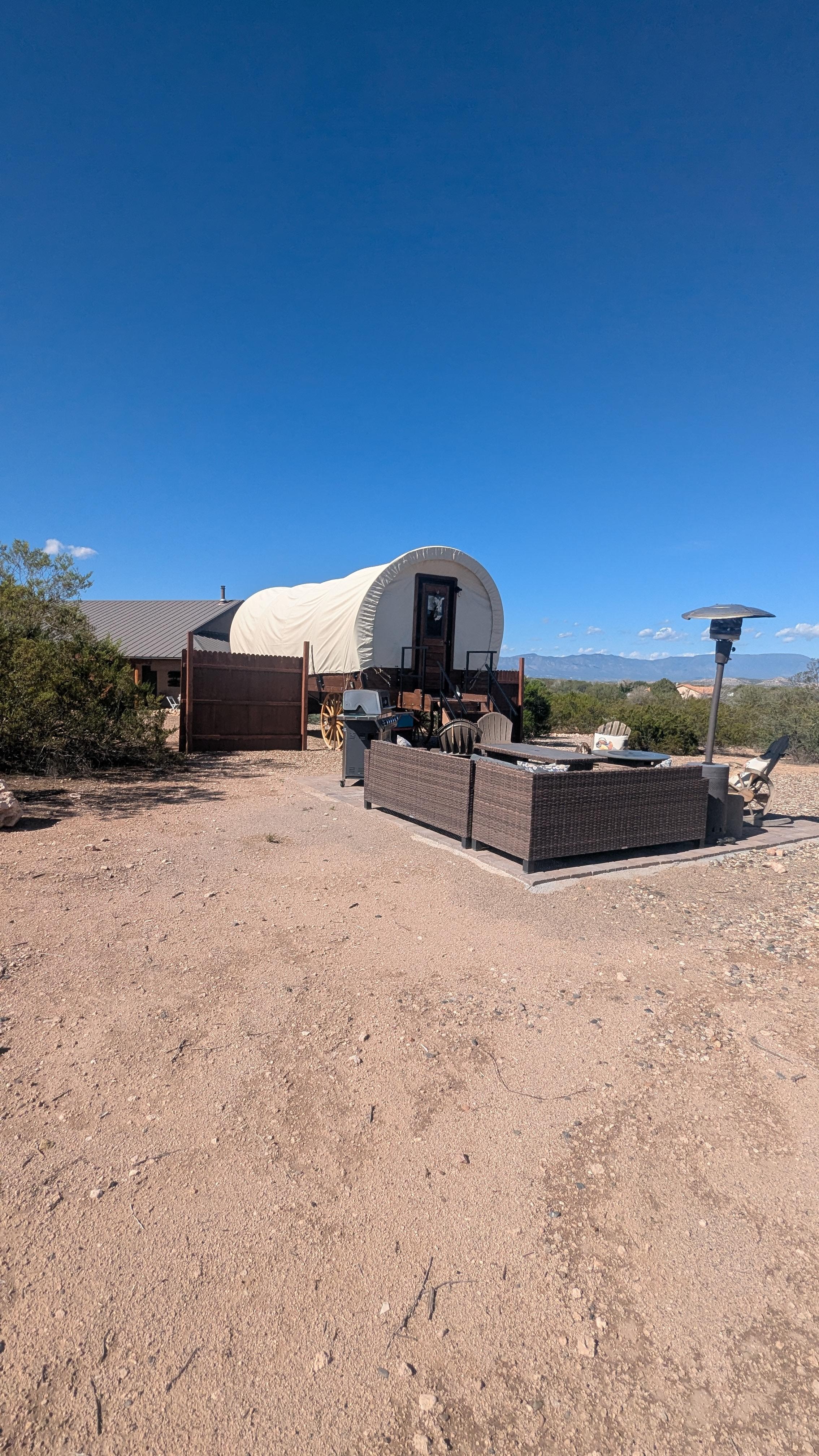 As you travel off the beaten path, you see the a wagon off in the distance, and the excitement and curiosity grows. Upon arrival, we were just in awe of the pure perfection of this Covered Wagon! My husband and 2 teens and I couldn't wait to explore the grounds and our quarters for the night. The property was gorgeous with trails, views and vistas all around. At night, we were able to watch the moonlit sky in the hot tub, then chatted around the fire. We chose to catch the sunrise and even through a cloudy morning, the sun still managed to peek through and it was breathtaking. The inside is completely charming and cozy. The decor is cute and not overdone, and the beds are wonderful. The heater inside the coach kept us warm and snuggly through the night. The outdoor shower was liberating! There are 2 dollar stores nearby for snacks and drinks, of whatever you might need. We were thrilled to have stayed here for the last night of our Arizona Adventure! Many thanks for sharing your property with us!table!