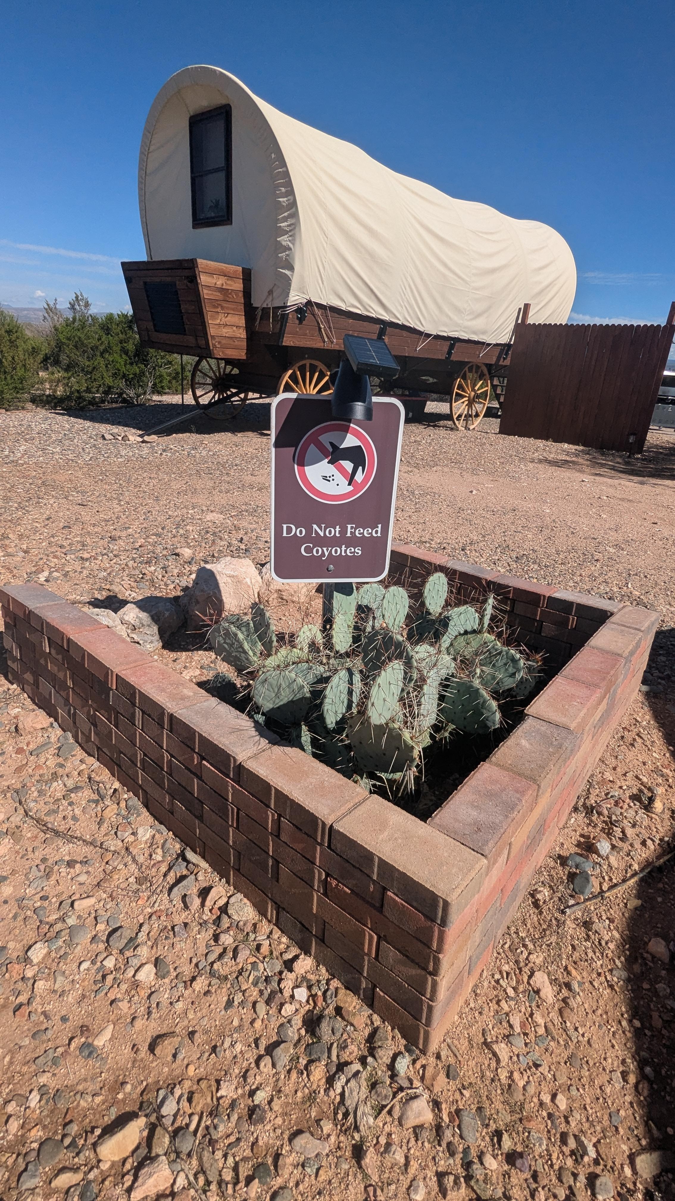 Make sure you arrive during the daytime because trying to find the place in the dark is very time consuming because there are no lights lighting up the covered wagon and there are no signs to indicate where to drive or park a car. I can tell you that where the sign says "don't feed the coyotes" is a good spot to park. I felt like the place wasn't ready for us because the jacuzzi still had eight 10 lb weights on it and the propane gas for the patio heater and fire ring was not working properly or was out of fuel. I addressed it with the property manager however she just said that there was fuel under the stairs and that I could do it myself. I'm a disabled veteran so that was not going to happen. The barbecue was in working order however if you want to use the patio during the daytime you need to bring your own shade because there isn't even the umbrella that is supposed to go into the table. When you are going to the bathroom it is the most brightly lit thing however there is not a path brightly lit to get to it at least when you're coming after 9:00 p.m. when the solar lights are faded to nothing and the path is meandering behind in between bushes which for anyone afraid of squirmy or other vermin that's not a path they want to take. You end up having to cut through a rock garden which is a little uneven and this is obviously not meant for walking through what is clearly the most direct path to the bathroom. The outshower doesn't get hot like advertised and there is no door