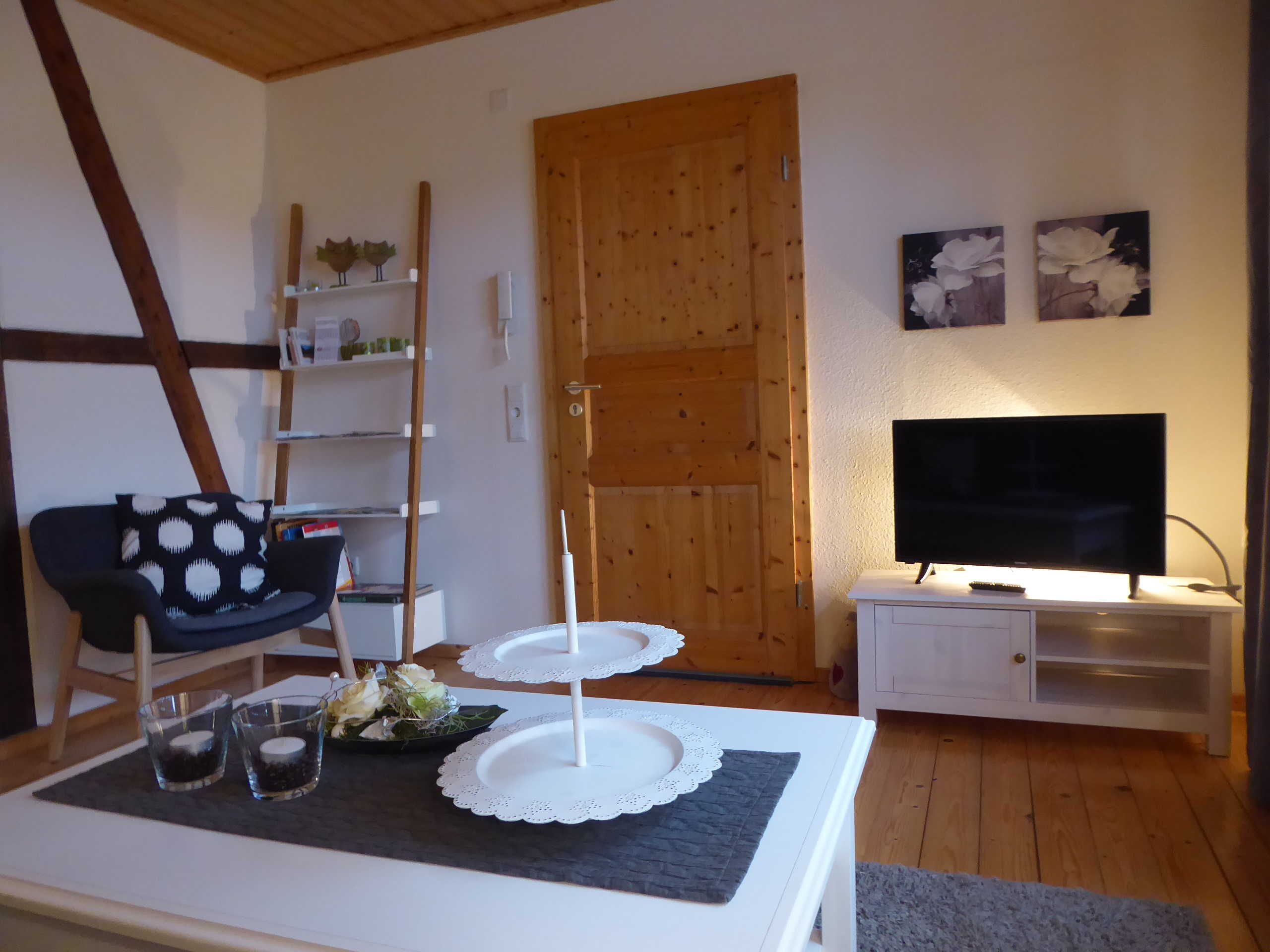 "Lindenstraße", 2-room apartment 75 m2, on the ground floor. Renovated in 2024, modern and cosy furnishings: living/sleeping room with 1 sofabed, satellite TV and flat screen. Exit to the terrace. 1 room with 1 double bed (180 cm, length 200 cm). Large kitchen (oven, dishwasher, 4 induction hot plates, toaster, kettle, microwave, freezer, electric coffee machine) with dining table. Shower/WC, sep. WC. Oil heating. Wooden floors. Terrace 12 m2. Terrace furniture, deck chairs (2). Facilities: children's high chair, baby cot. Internet (WiFi, free). Parking (roofed) at the house. Please note: non-smokers only. Smoke alarm, fire extinguisher.