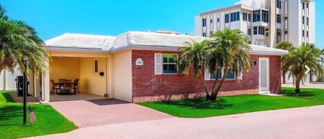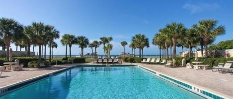 The lanai has an additional dinette, a couch, reading space, ceiling fans, and stunning open views of Crescent beach.