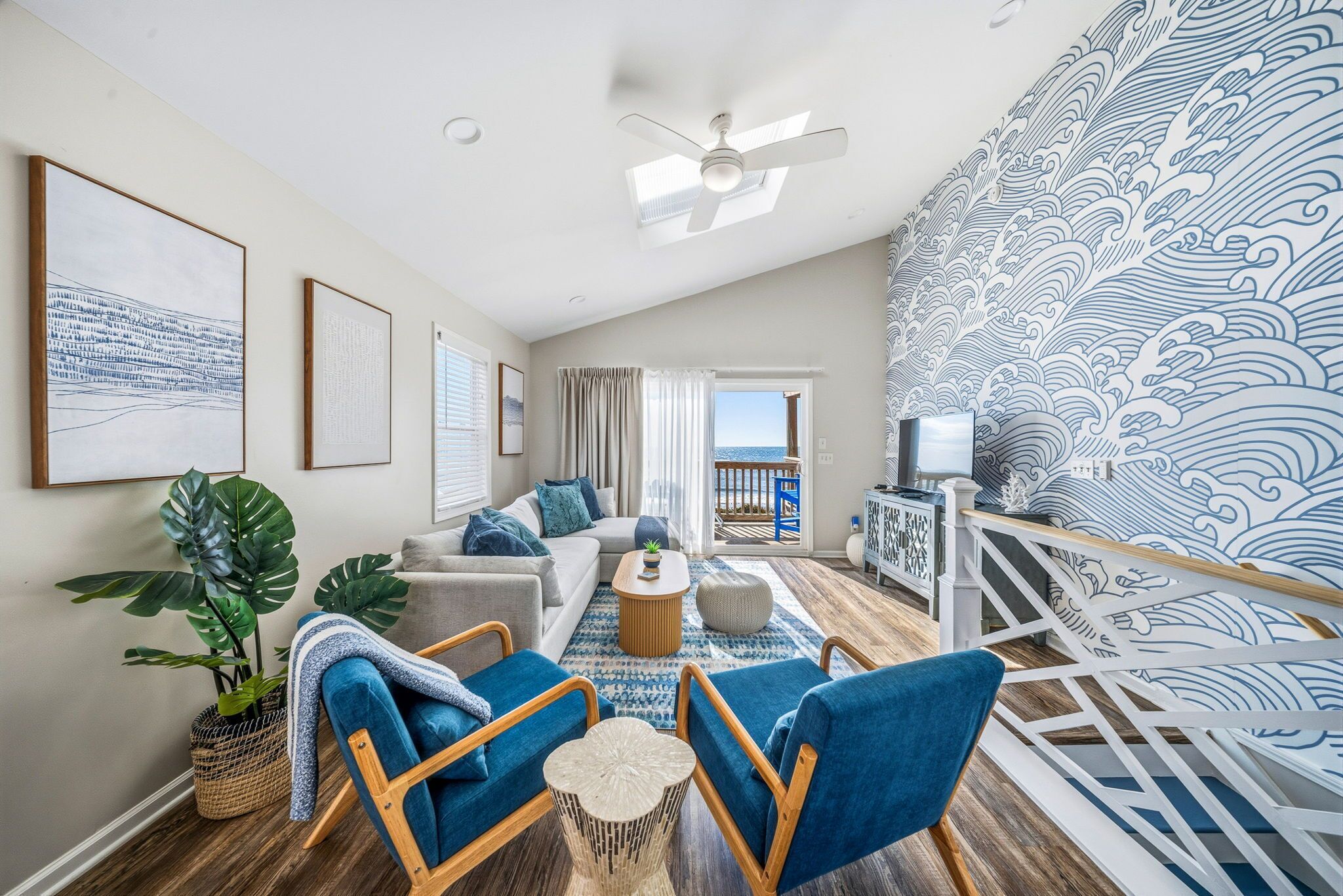 Living Room Area with Comfortable Sectional and Cushioned Sea Grass Side Chair, Oversize Smart TV with Streaming Service, Ceiling Fan, Wood Occasional Tables