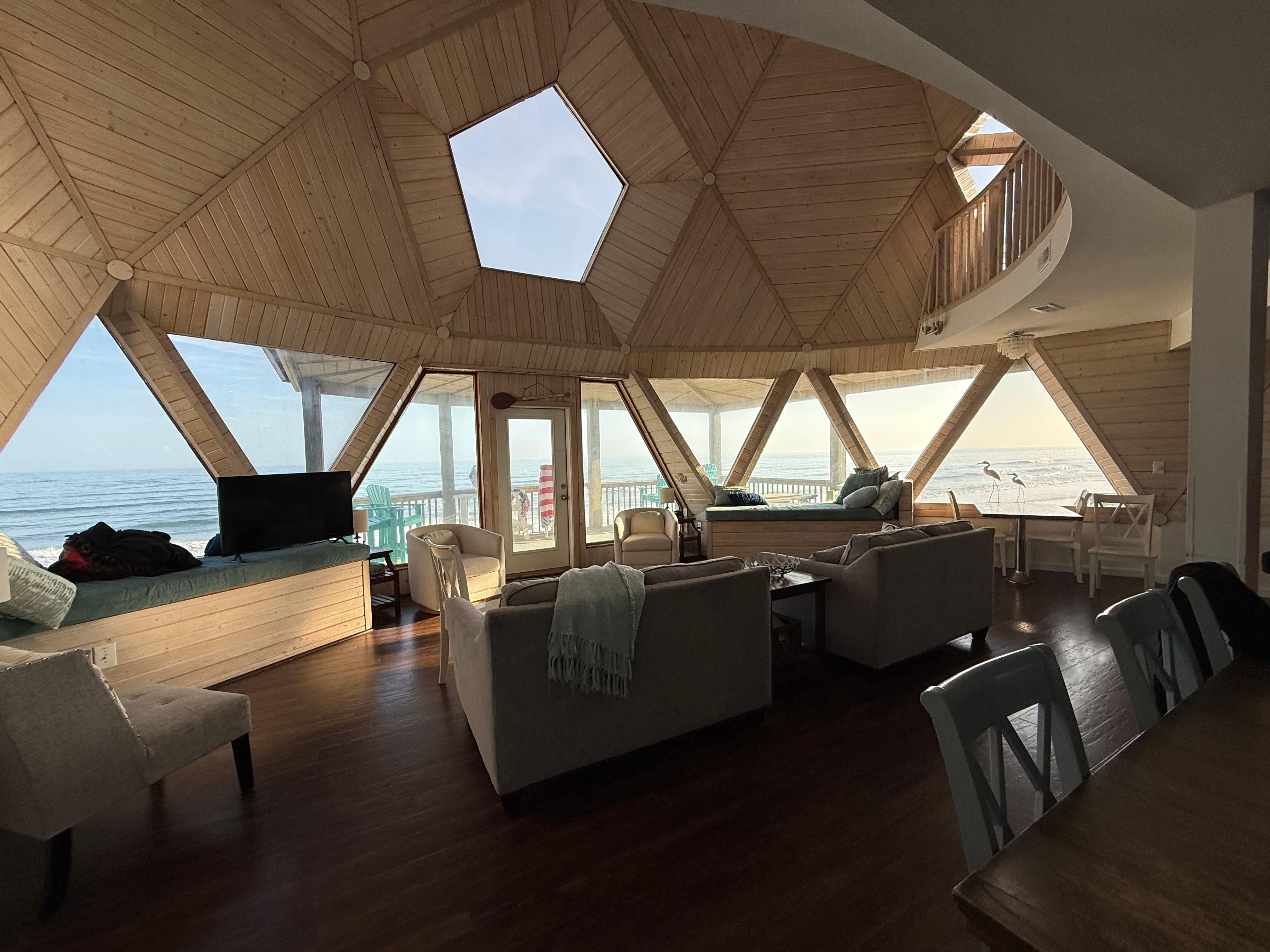 This iconic 6-bedroom, 4-bath beachfront property boasts 180-degree ocean views. Wide windows that pierce the panels of the unique dome-style architecture allow for swaths of natural light to flood the space and showcase stunning views of waves crashing on the beach - from almost every room!