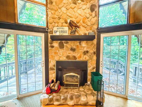 The living room boasts cathedral ceilings, a wood-burning fireplace, and sliding glass doors that open onto a spacious upper deck, nestled in the woods.