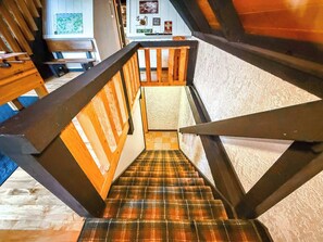 Additional stairs in the entryway lead down to the lower level where you may access the sauna that is shared with the lower unit. Book your stay at Alpenhaus Chalet today for your next group vacation!