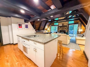 The main levelâs hallways create a loop around the home, leading you to four additional queen bedrooms, two full bathrooms equipped with bathtubs, and the kitchen and living areas. The kitchen is fully stocked with everything you need to prepare your favorite meals, including a four-burner glass-top stove and oven, a dishwasher, a microwave, and more! The wooden dining table accommodates up to eight guests, with a breakfast bar available for extra seating.